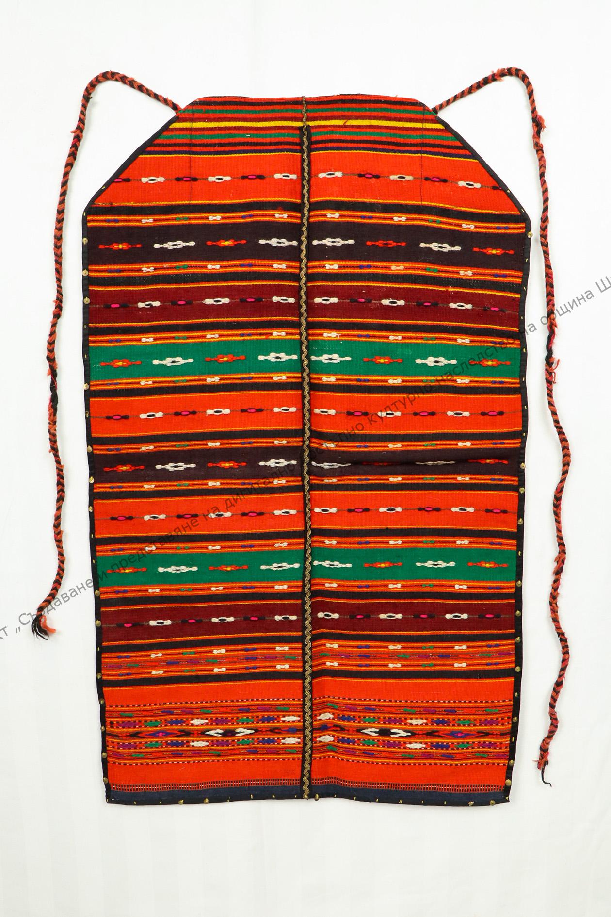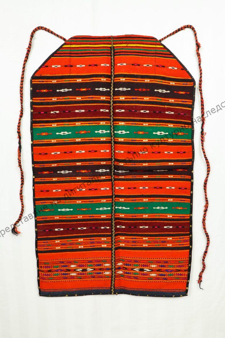 От вълна, двуплата. Украсена с разноцветни геометрични орнаменти, разположени в хоризонтални пояси, началото на XX век