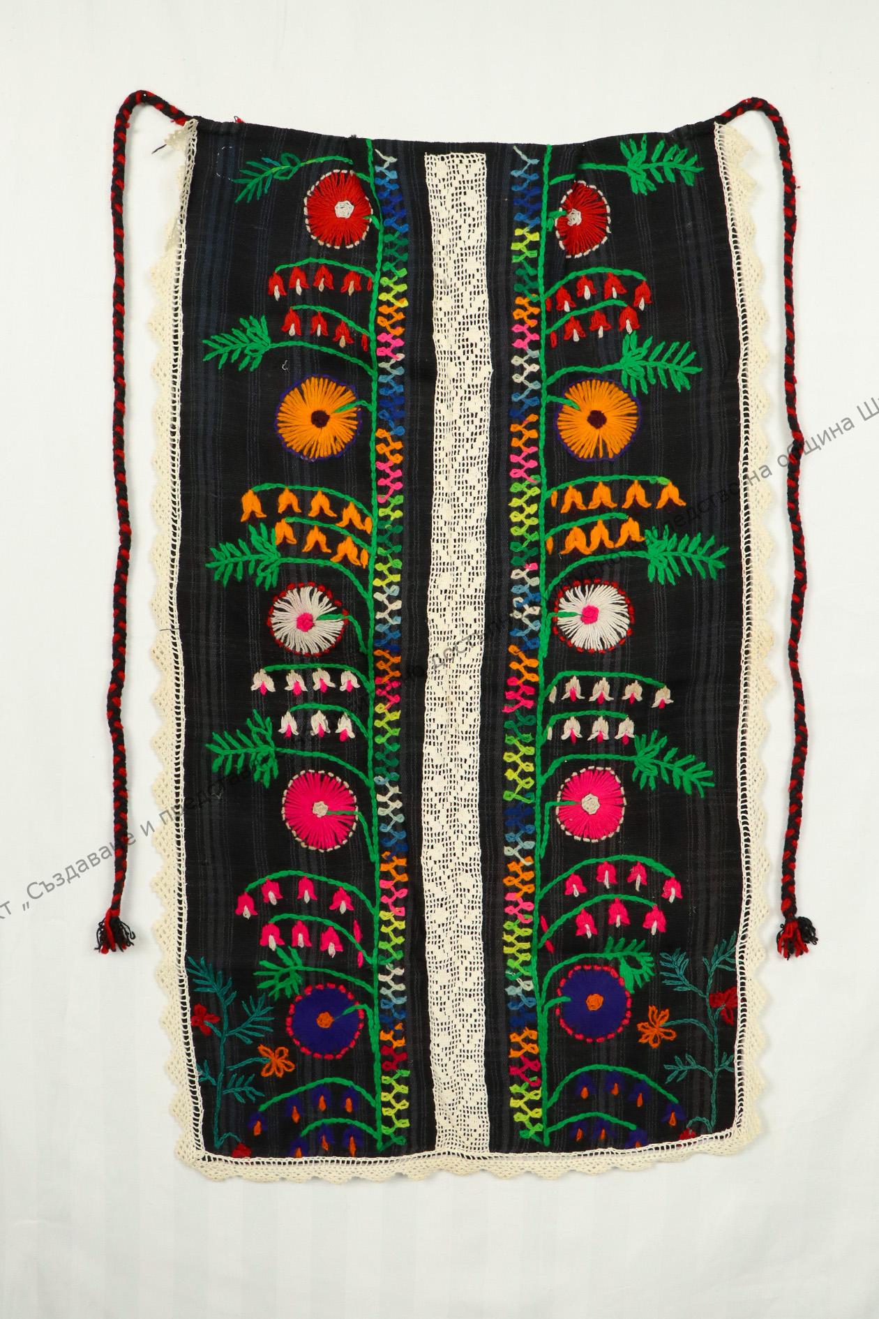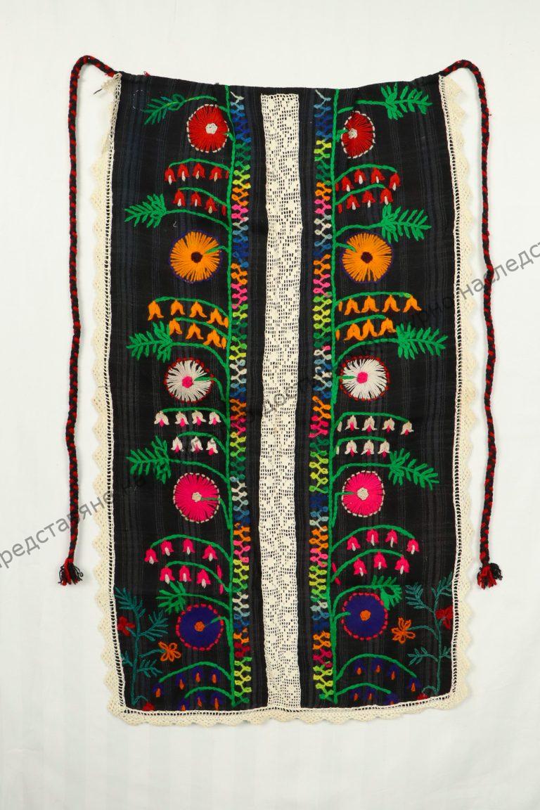 От вълна. Домашно тъкана, лито. Украсена с нашити растителни мотиви с цветни конци, 25-30-те години на XX век