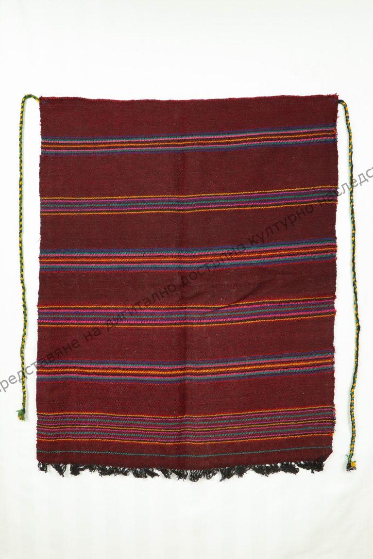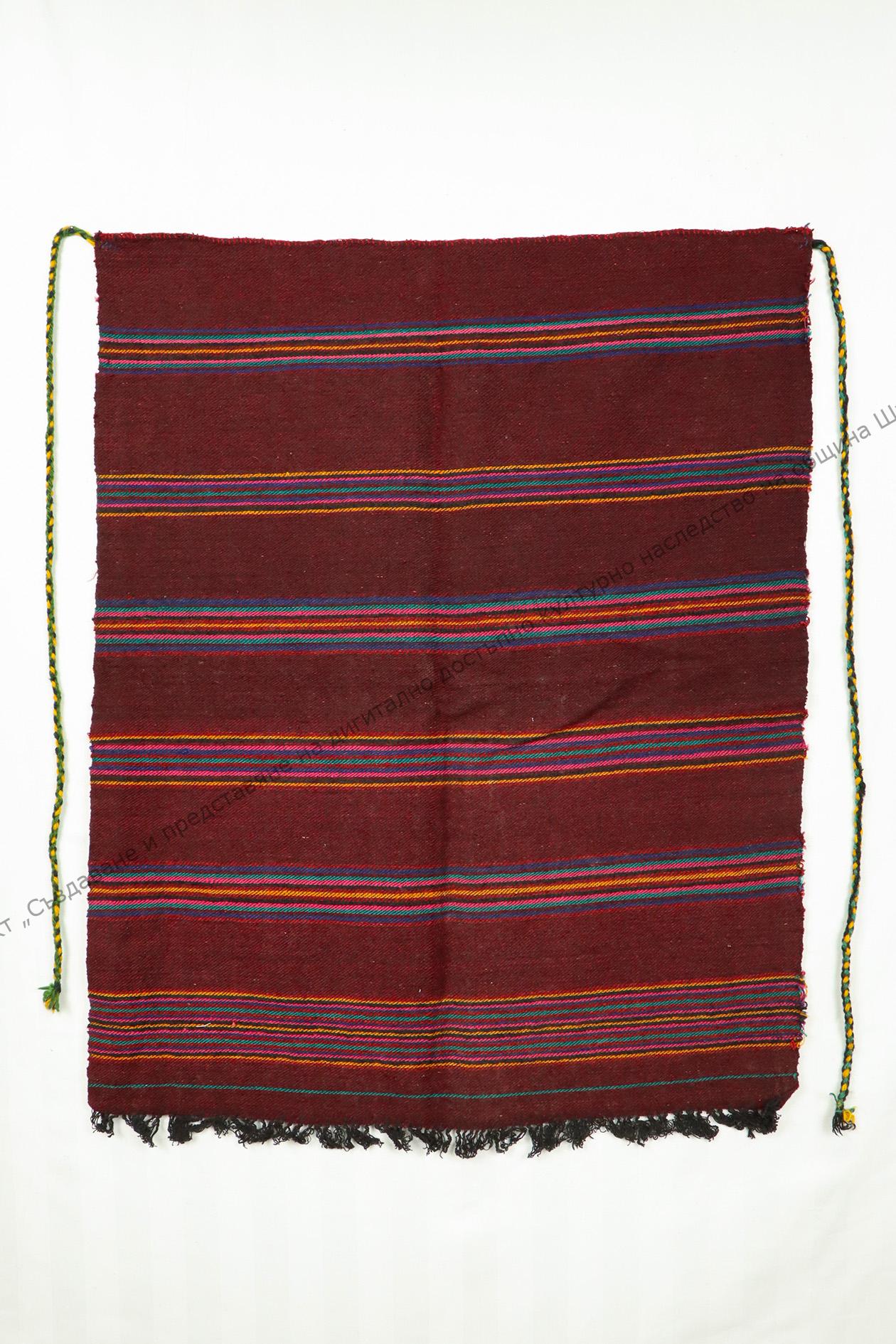 От вълна. Домашно тъкана, тип „котленска“. Тъкана на разноцветни ивици