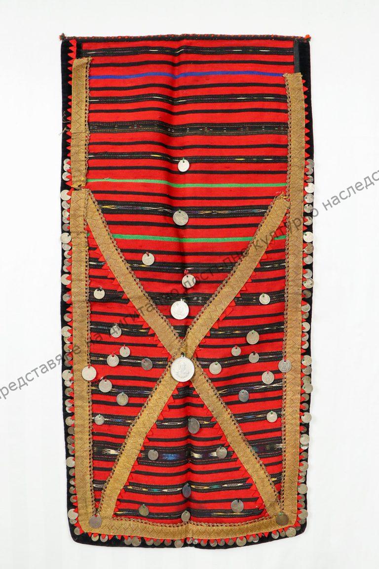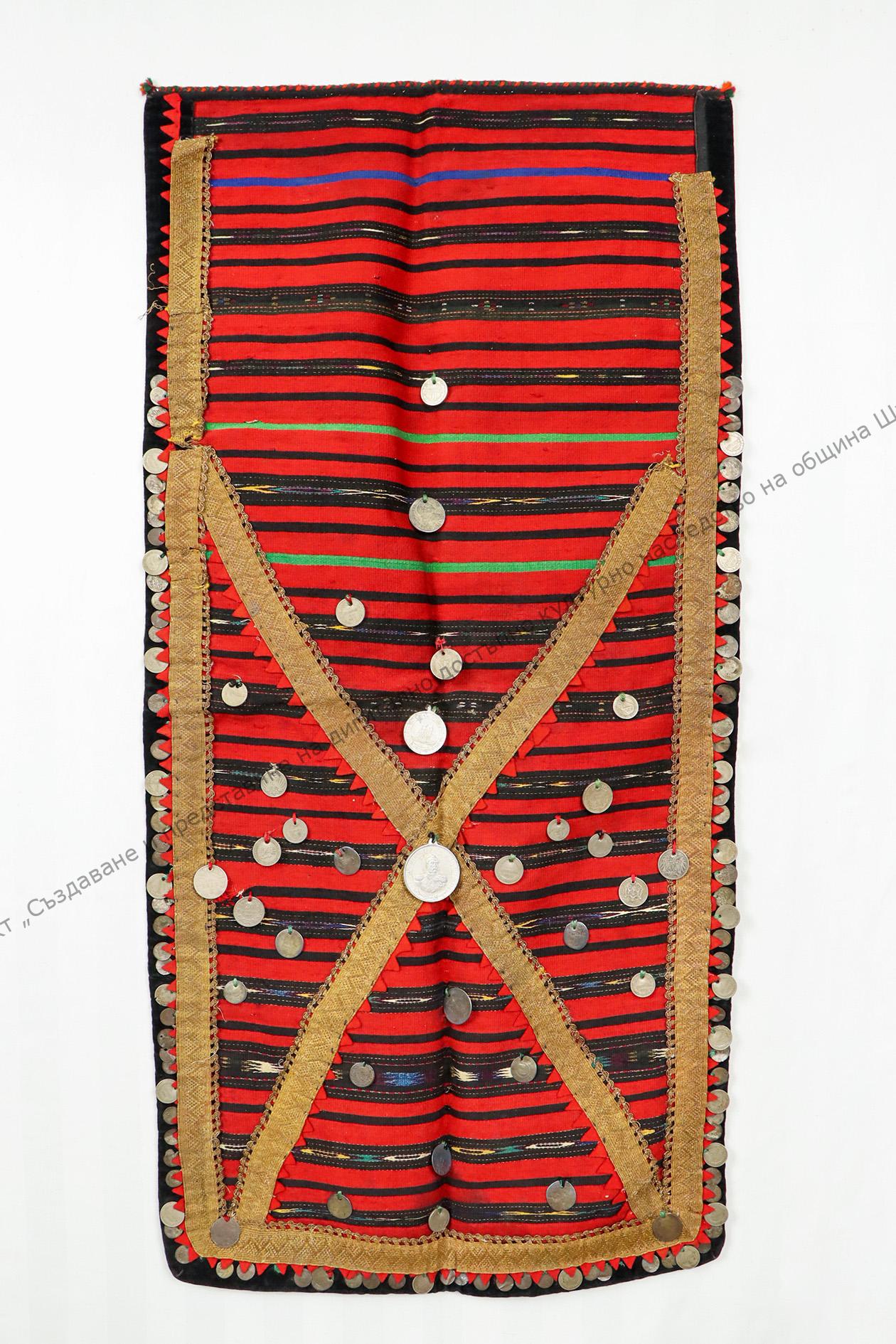 Македонска. От памук. Домашно тъкана, тип „индиена“. Тъкана на разноцветни ивици с втъкани сърмени нишки. Украсена с пришити различни монети, втората половина на XIX началото на XX век
