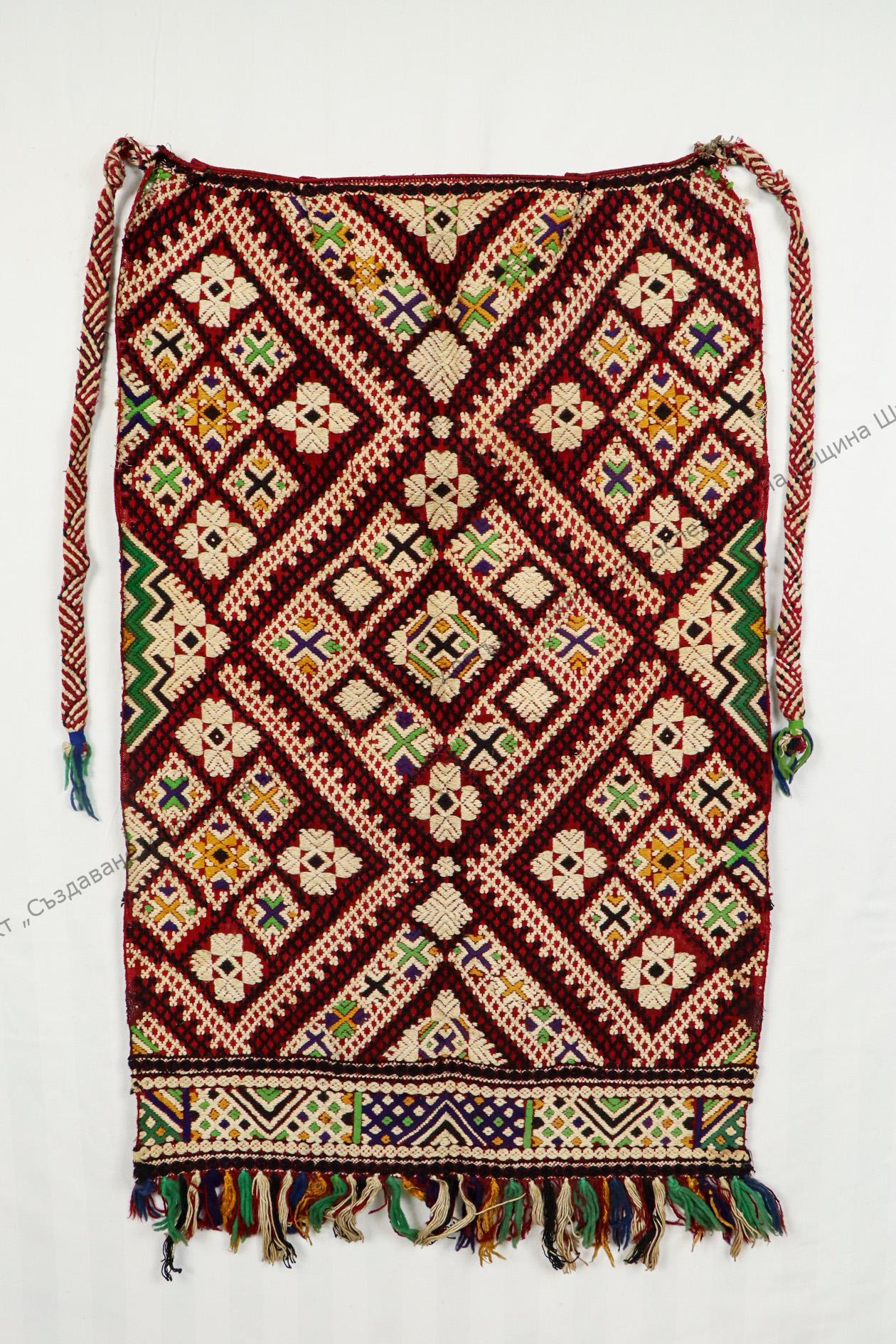 Тип „добруджанска“. От вълна, домашно тъкана. Украса от тъкани с разноцветни конци геометрични и растителни орнаменти, края на XIX век