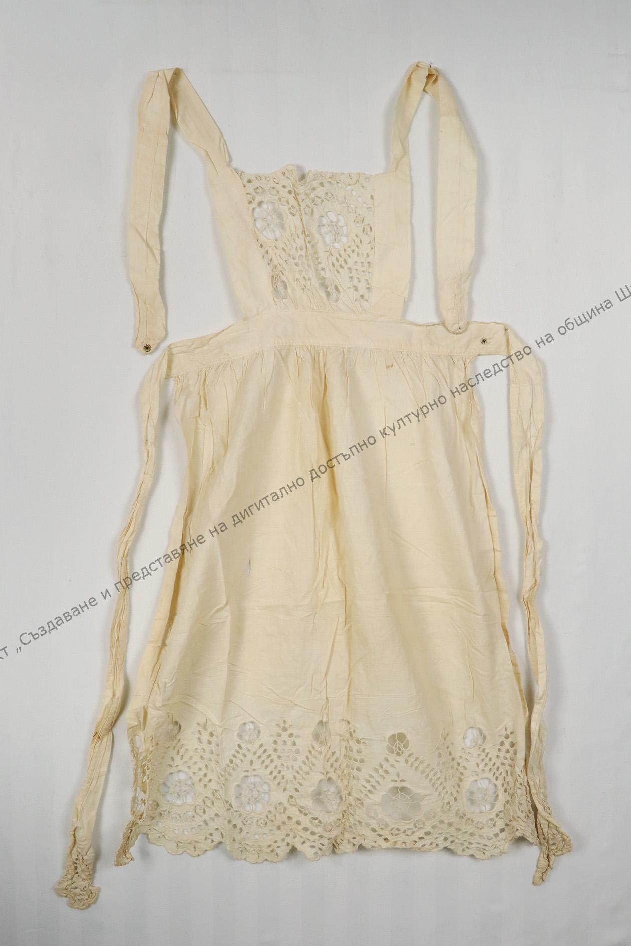 Градска. От фабричен памучен плат. С украса от ажурна бяла бродерия, края на XIX век