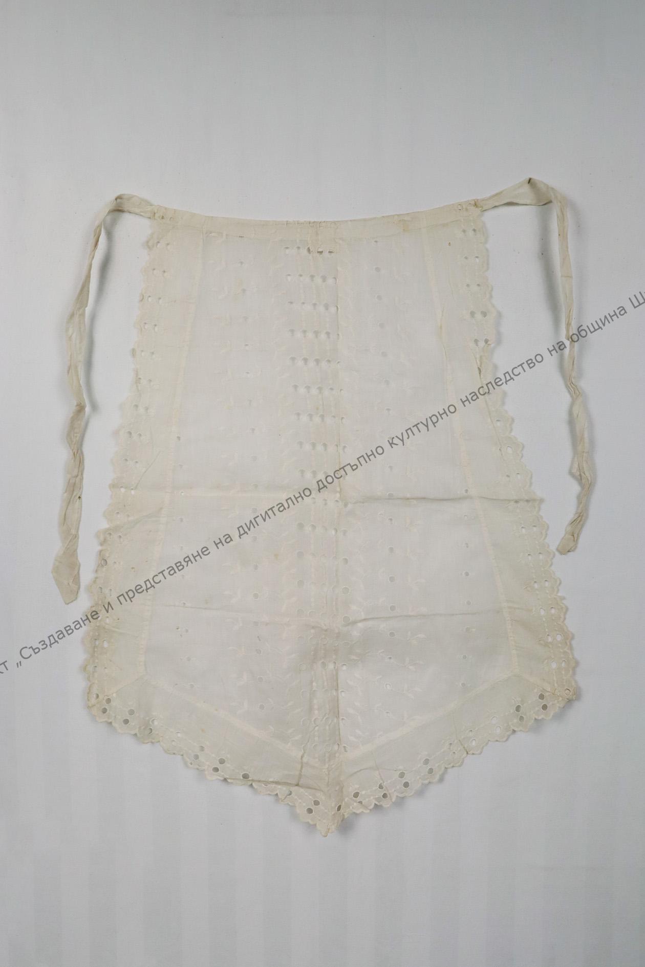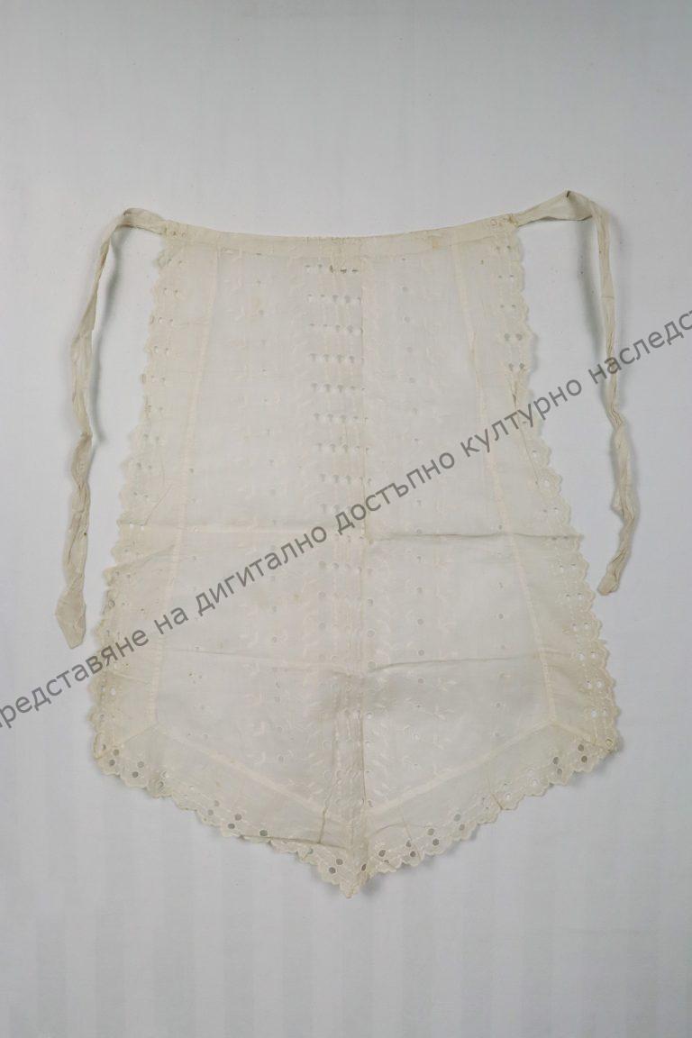 Градска. От фабричен памучен плат. С украса от ажурна бяла бродерия, началото на XX век