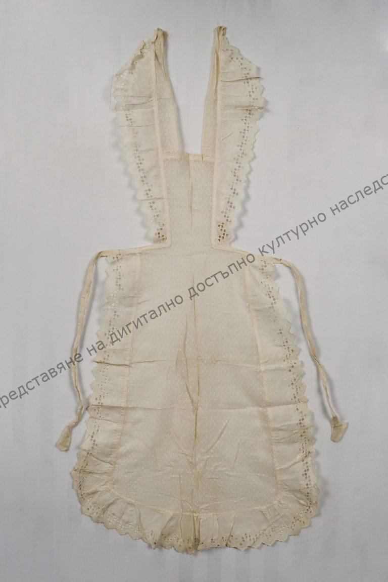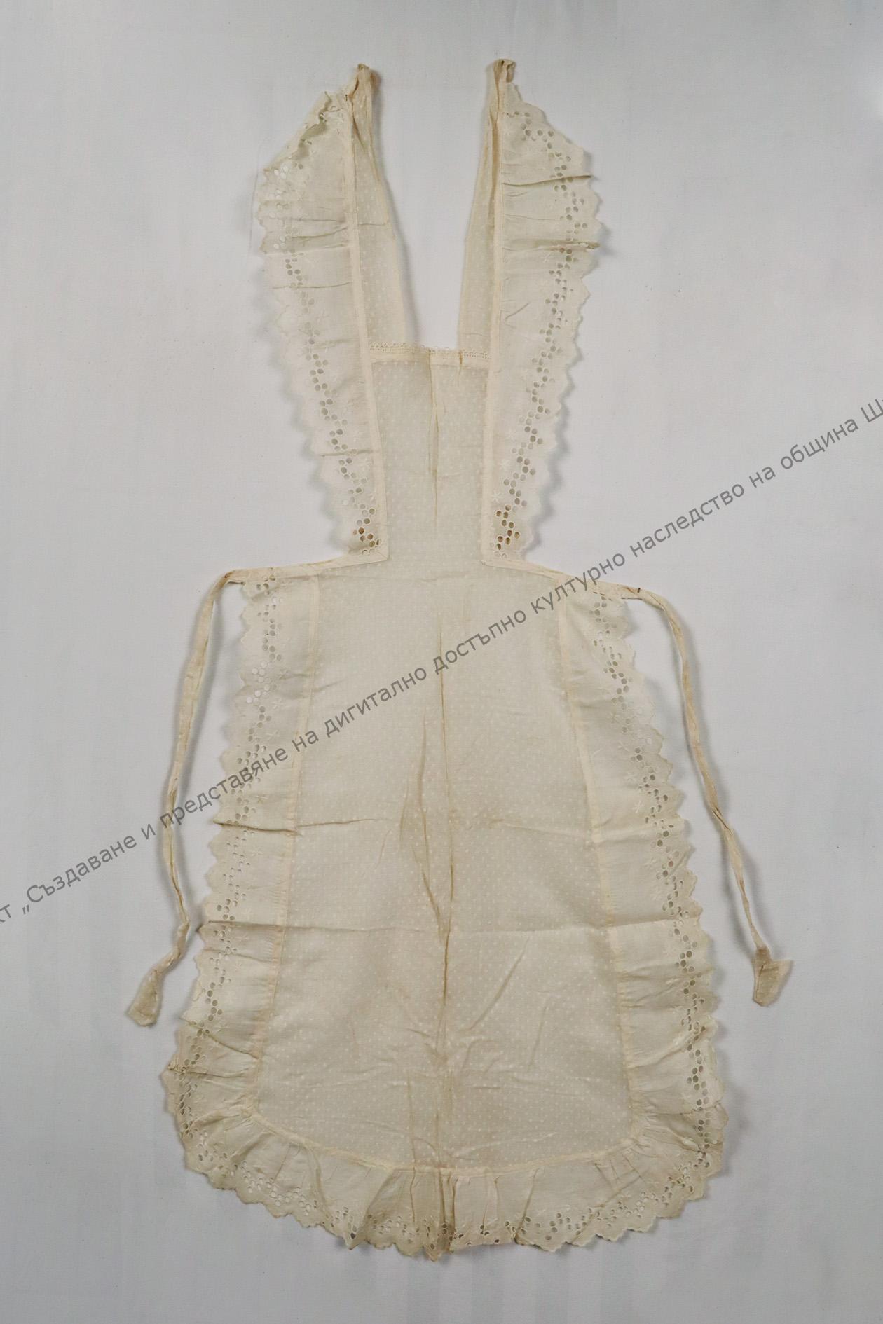 Градска. От фабричен памучен плат. С украса от бродирани фестонирани къдри и дантелка, началото на XX век