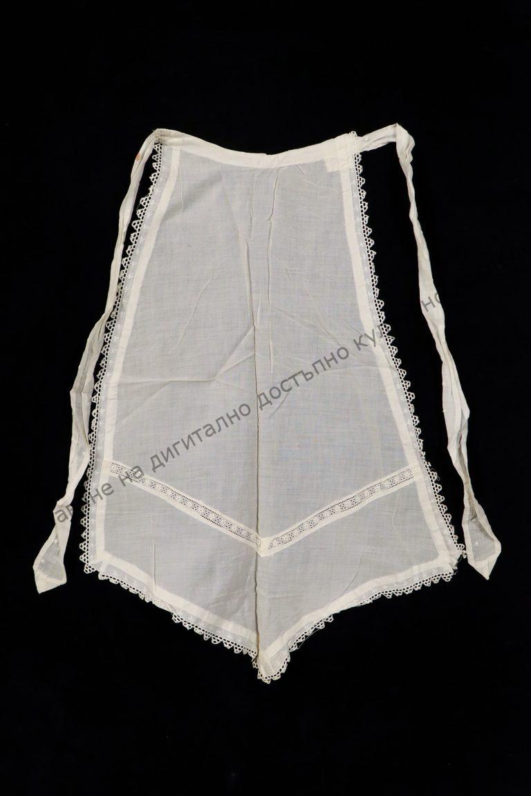 Градска. От фабричен тънък памучен плат. Фестонирана. С украса от ажурна бродирана шевица, 25-30-те години на XX век