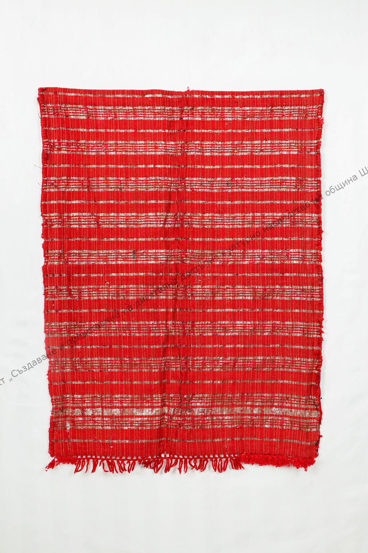 Домашно тъкана, памучна основа, вълнен вътък. Украса от втъкани ивици от сърма. Изработена за чеиз