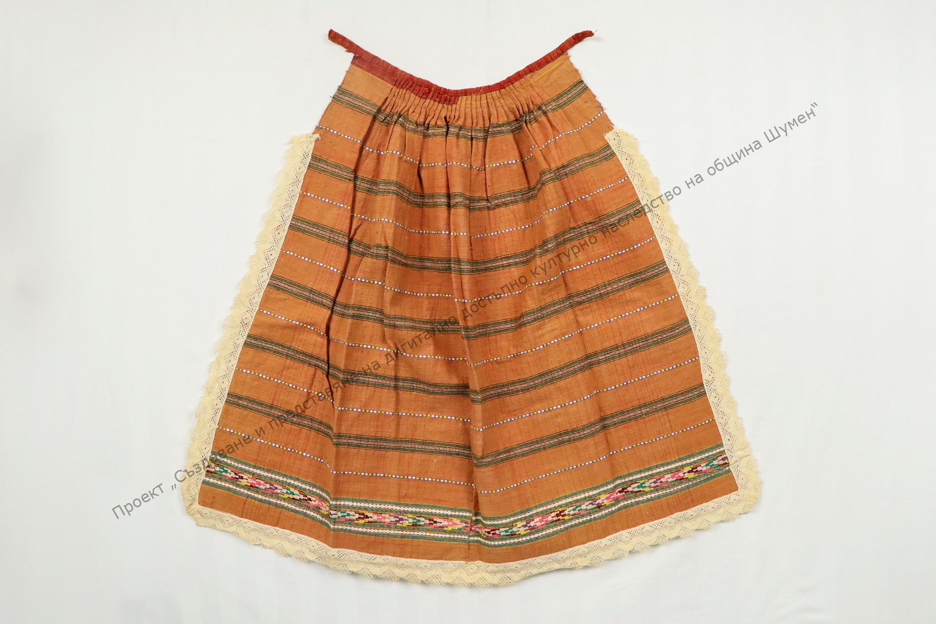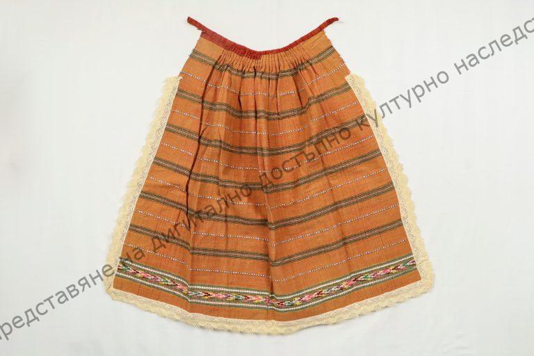 Домашно тъкана, лито. Тъкана на разноцветни ивици, най-отдолу втъкани геометрични елементи. От хърцойска носия
