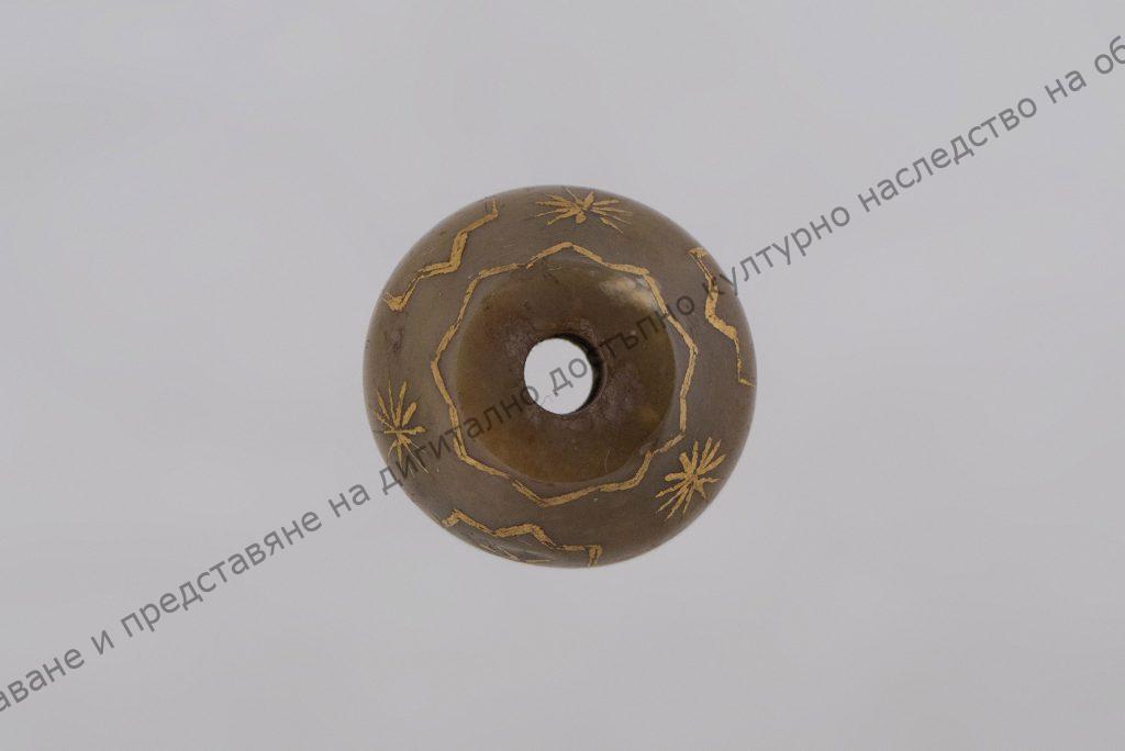 Средна част на мундщук на цигаре (чибук). Крушовидна форма, камък (кремък) в млечно-бежов цвят, с инкрустация.