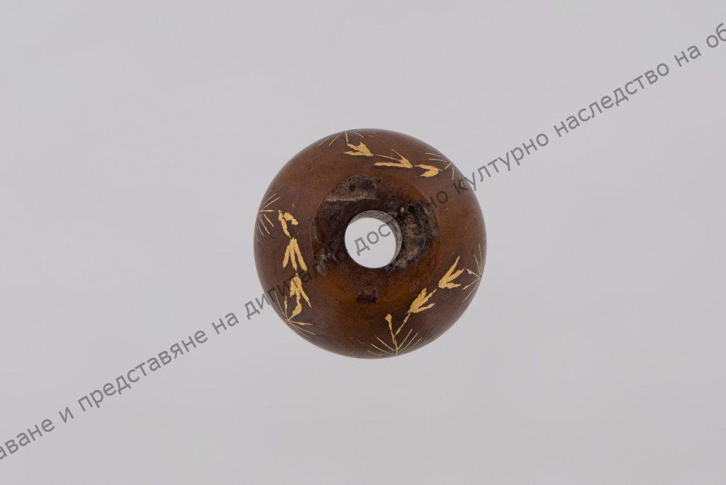 Средната част на мундщук на цигаре (чибук). Крушовидна форма. От камък в тъмно-кафяв цвят, с инкрустация.