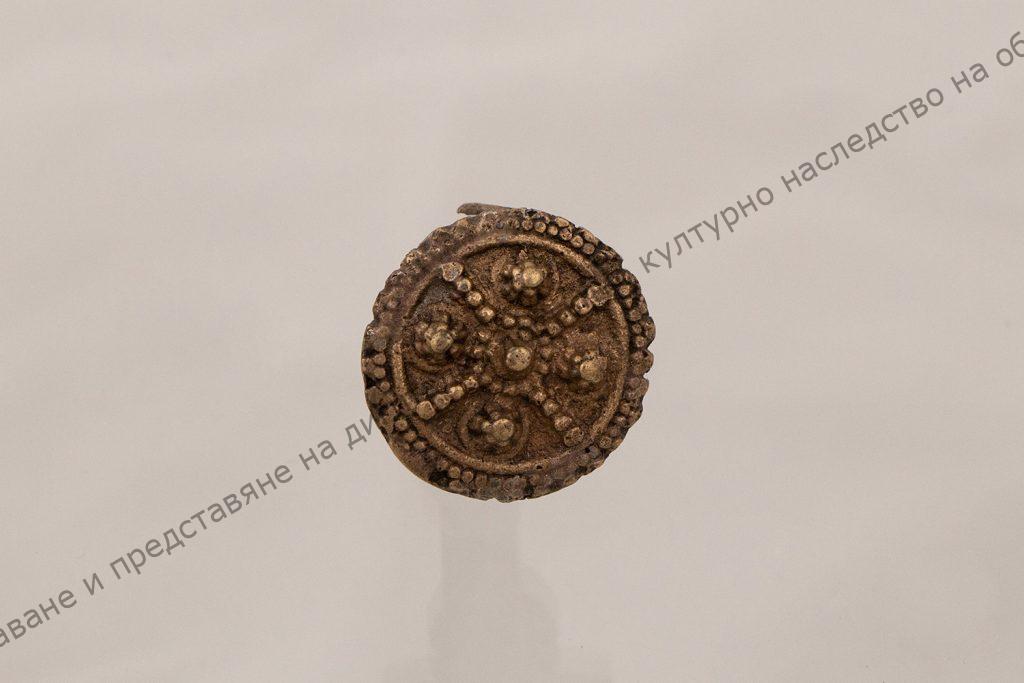 Тип ,,столоват‘‘. Метална, висока, кръгла плочка. В края окръжност от гранулирани точки. В средата малко кръгче с 4 лъча. В пространствата между тях 4 бурмовидни плочки и в средата още една. Върху раменете – кръгла гранулирана плочка. Халката е украсена с плетеница.
