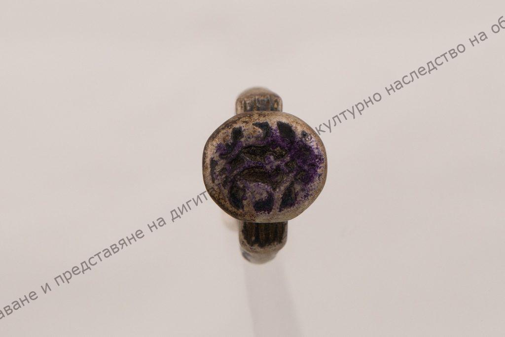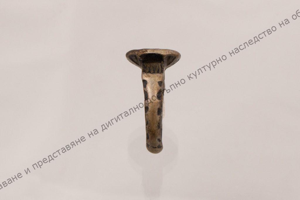 Сребърна халка с масивна разширена плоскост, украсена със стилизирани растителни мотиви.
