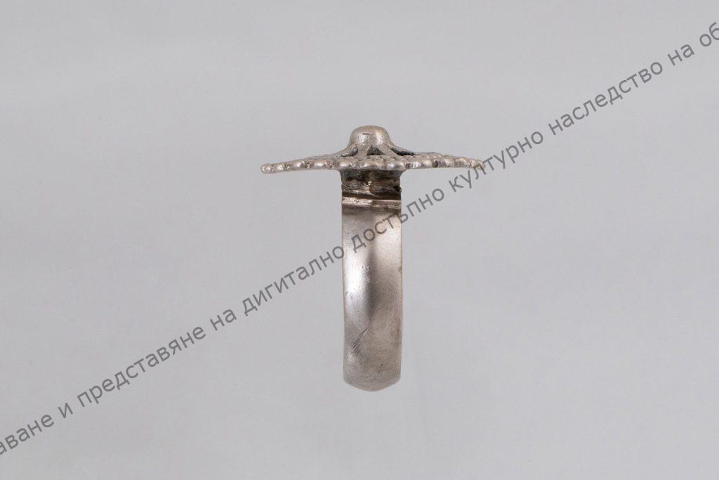 Пръстенът е изработен от сребро. Плоска халка, към която е заварена кръгла и плоска плочка, украсена с 3 концентрични линии. Полето между линиите е изпълнено с по-светъл и тъмен псевдоемайл. Датировка – края на XIX век