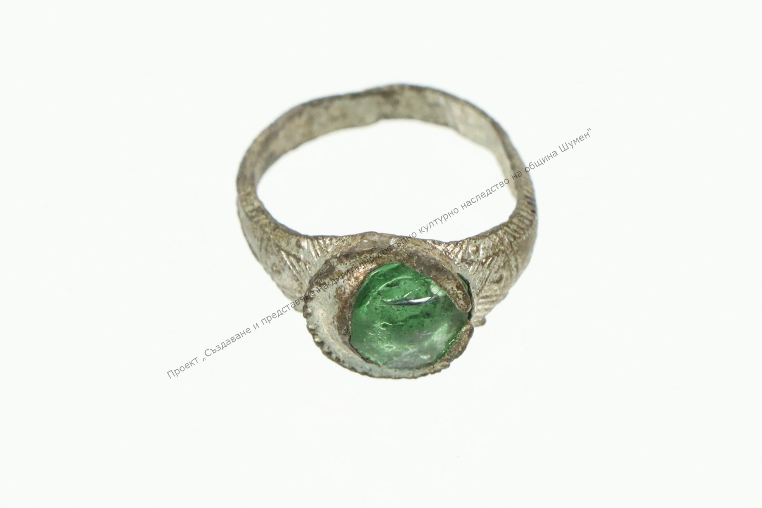 От бял бронз. Халката с гранулирана украса и чертички. Плочката кръгла, с ромбовиден камък. Принадлежал на шуменския златар Иван Куюмджиев