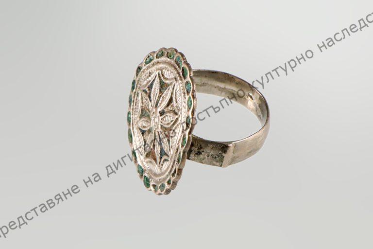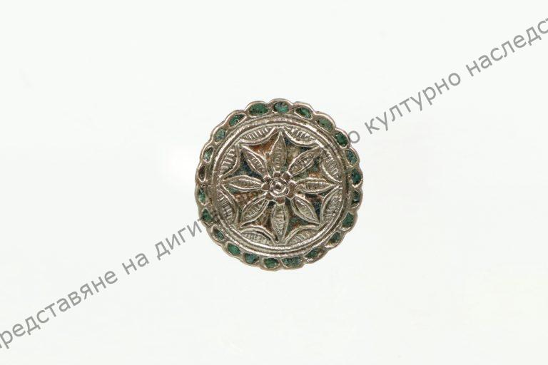 Годенишки. От бял бронз. Фестонирана плочка с гравирана украса и следи от зелен емайл