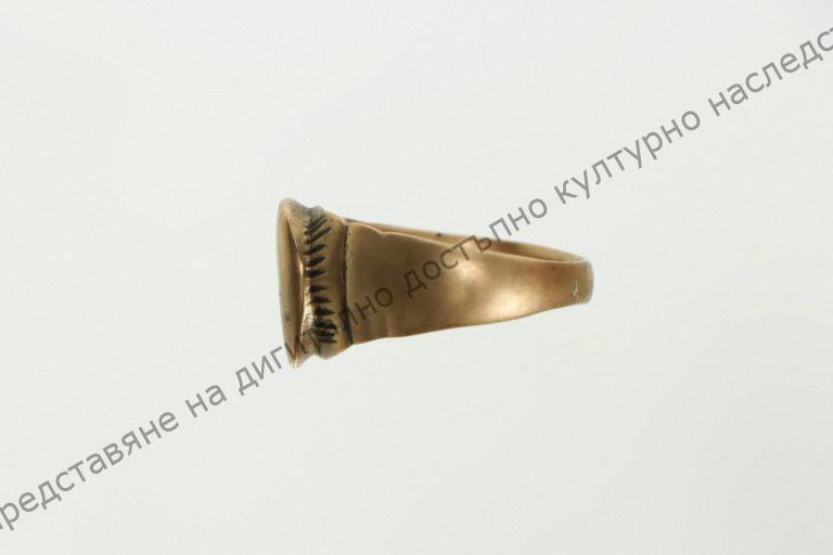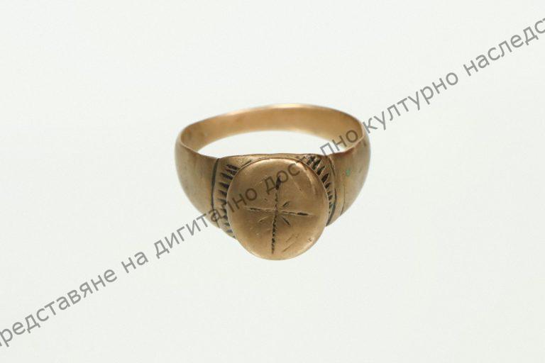 От бронз, мъжки. От горе – елипсовидна плочка с врязан кръст