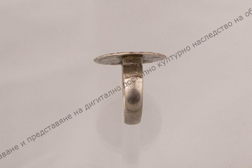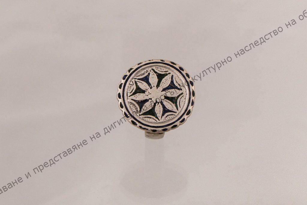 Сребърна кръгла плочка споена върху сребърна халка. Плочката в средата е с осемлъчева звездичка в кръг. Празните пространства са изпълнени със зелен и син емайл.