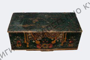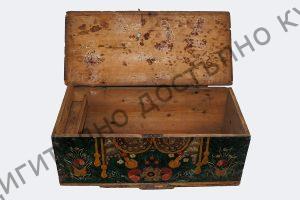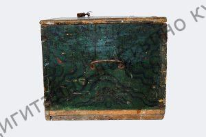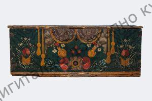 Горе на късата страна, изработена малка преградка с капак за съхранение на ценности и дребни предмети. Боядисана в тъмно зелено. Отпред изрисувана с разноцветна блажна боя.