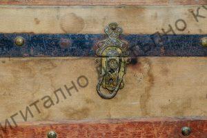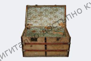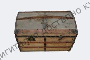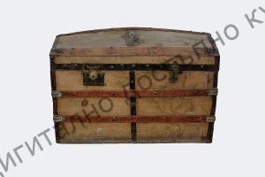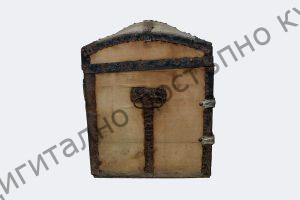С куполовиден капак. Облепена с памучен плат, бозав цвят, силно избелял. Обкована с тенекия.