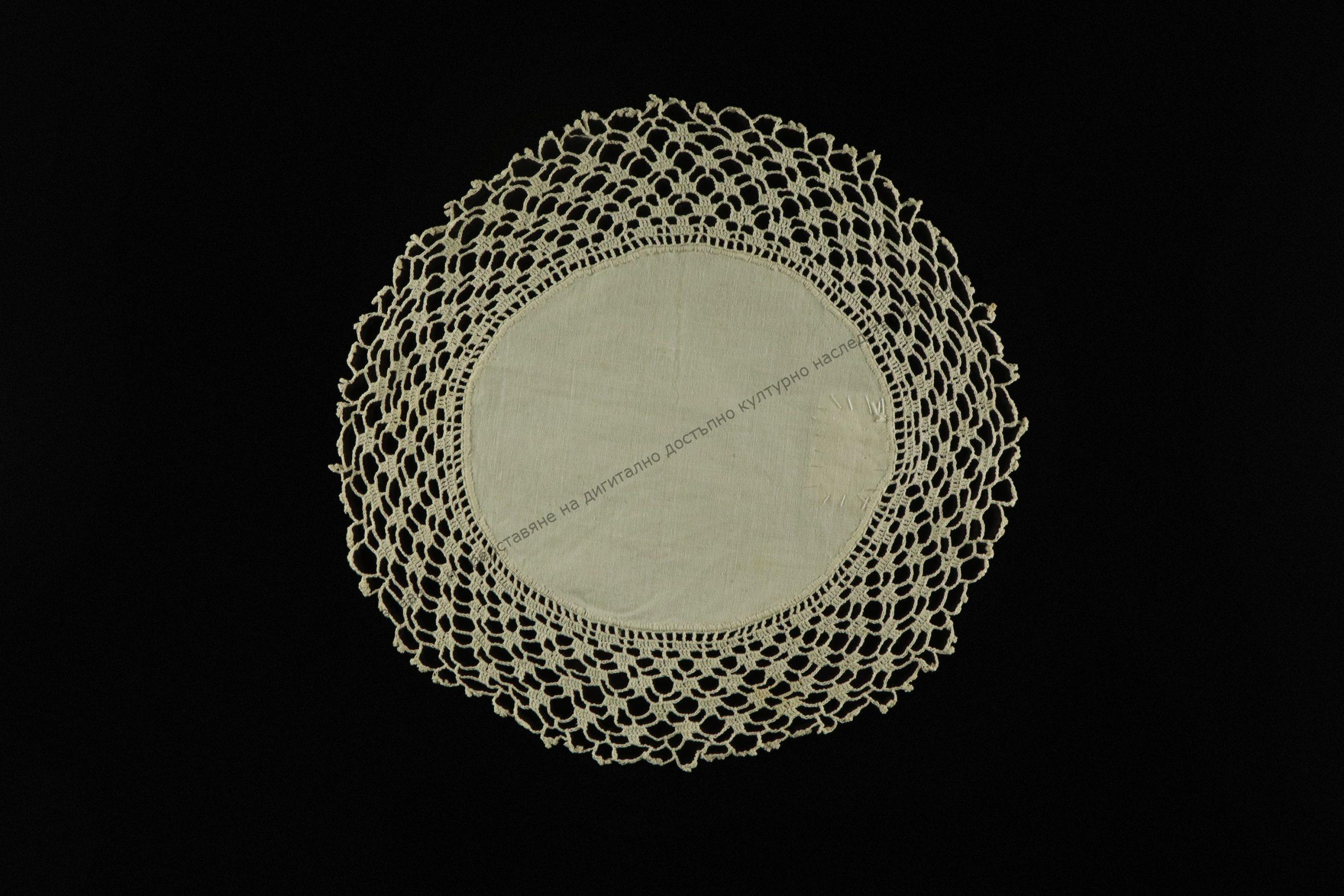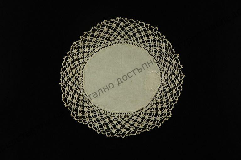 От бяло памучно хасе и дантела изплетена на 1 кука от памучни конци. Изработена през 30-те години на XX в., гр. Каспичан