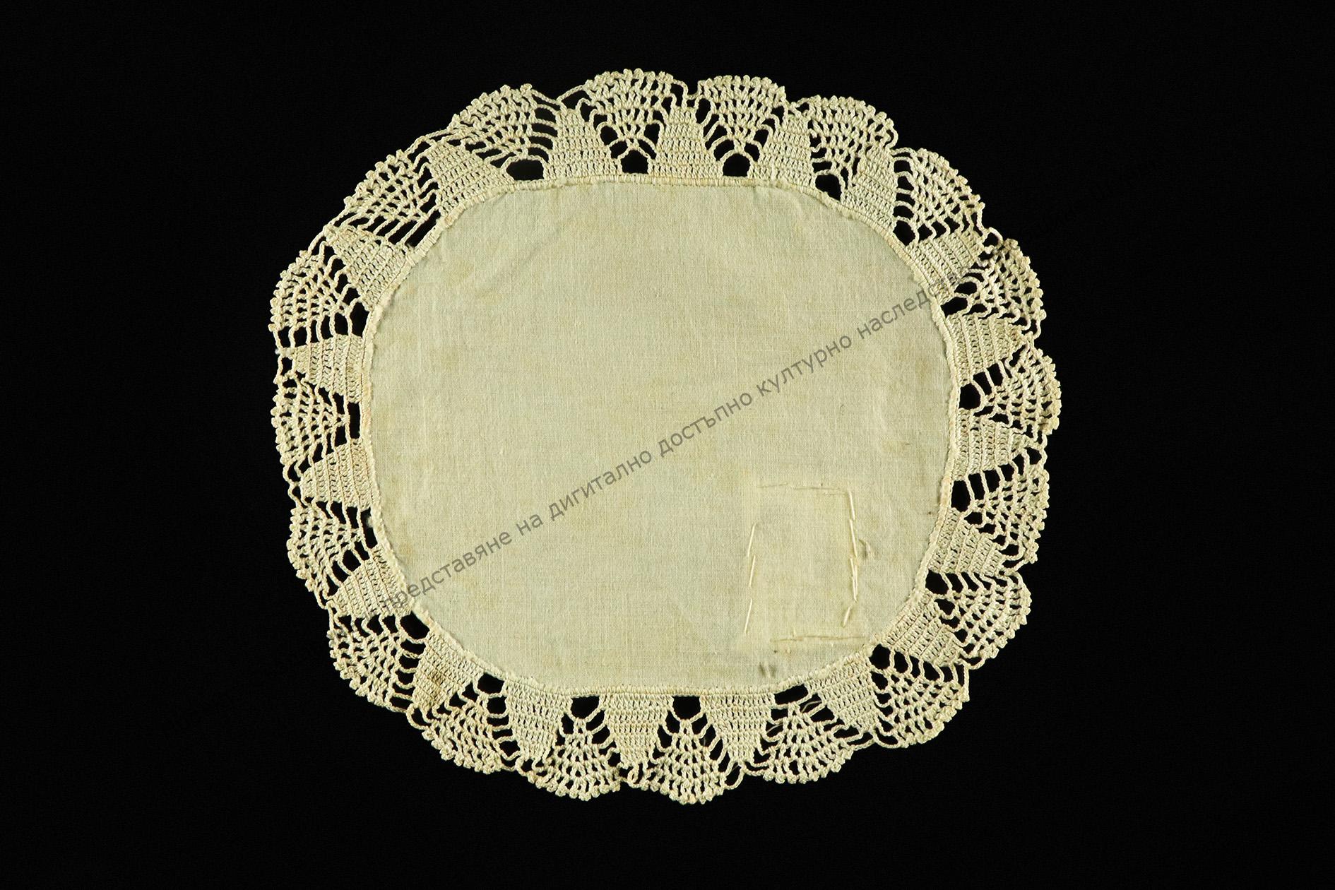 Изрязана от хасе, към нея е ръчно изплетена дантелка от бели ленени конци на една кука. Изработена от Блага Дунева, гр. Шумен, около 1925-1930 г. Използвана за покриване на кана до към 1950 г.