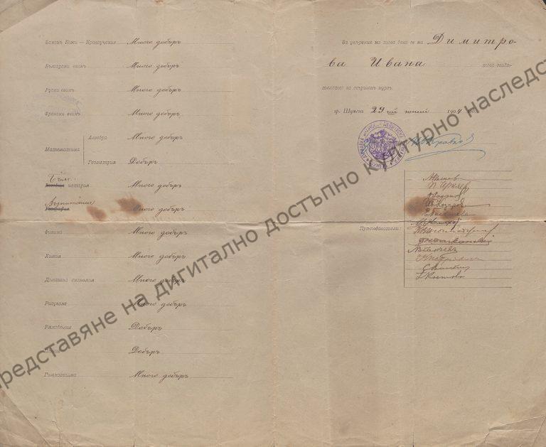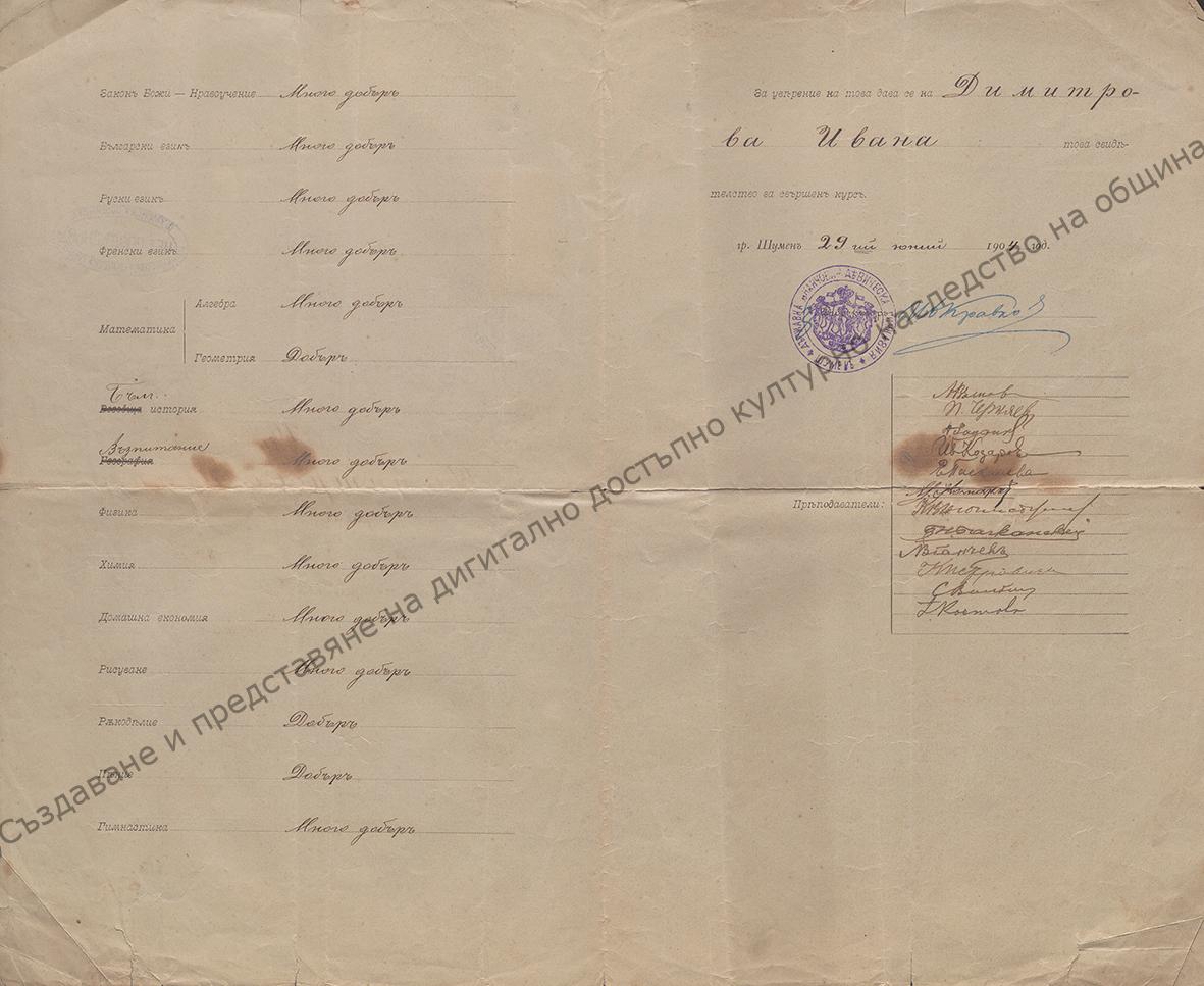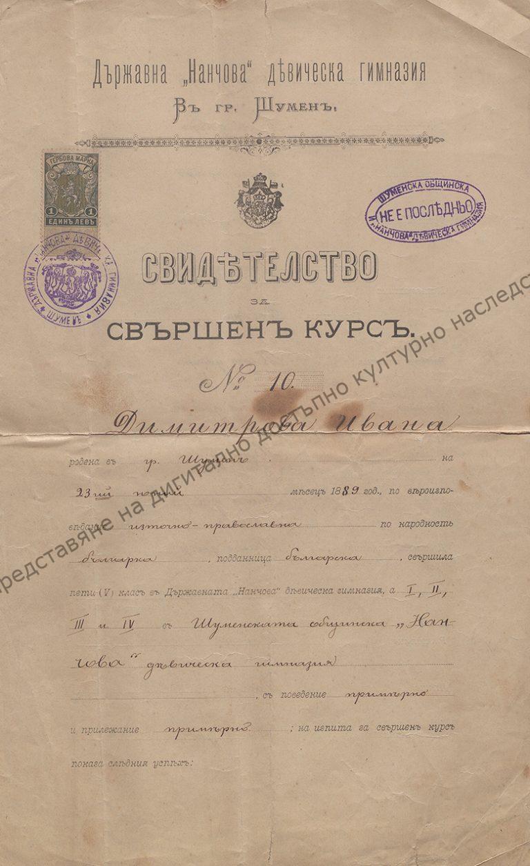 For completing the State “Nancho’s” Girls’ High School in Shumen. Issued to Ivanka Georgieva, 29th of June 1904