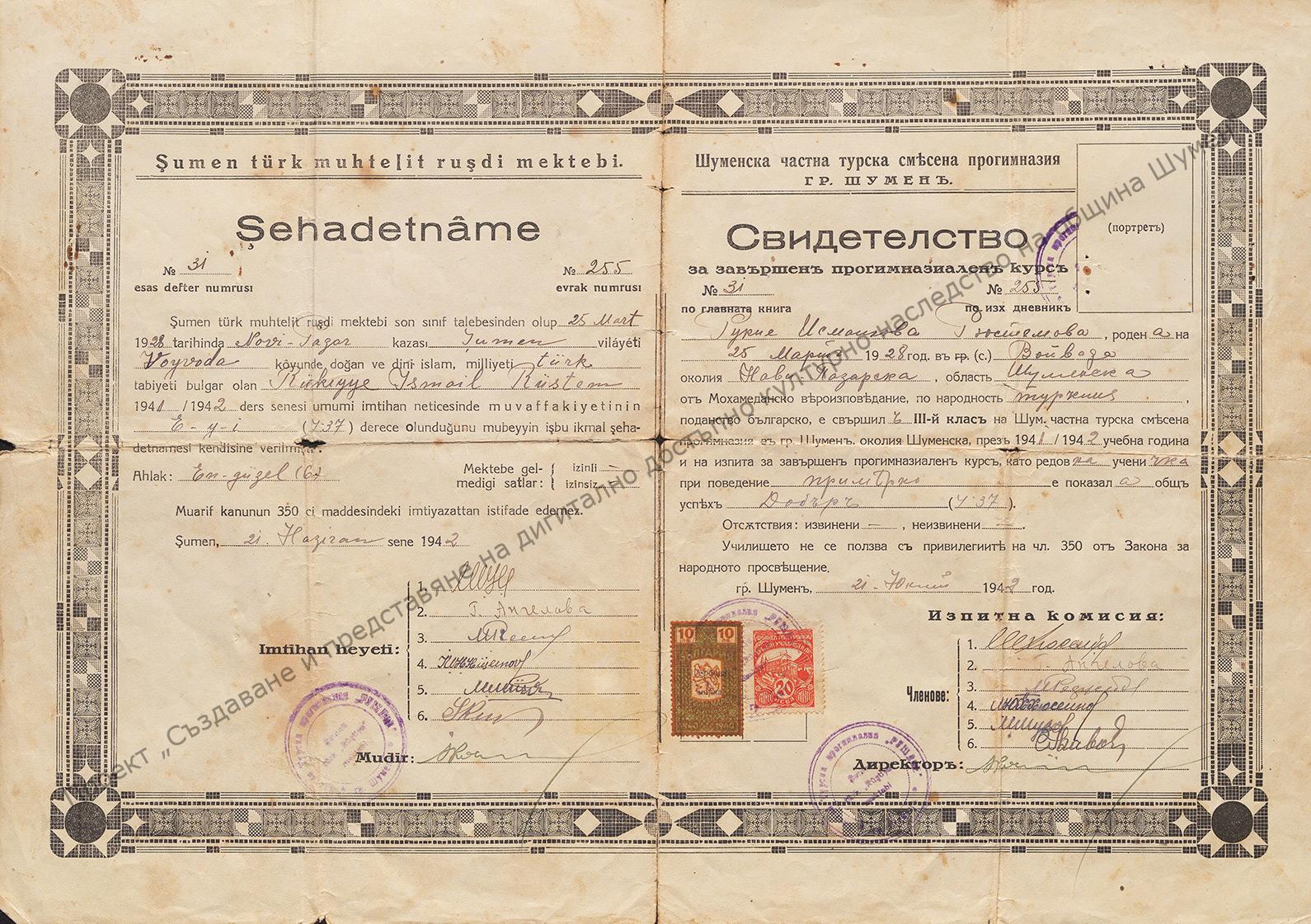 For completing junior high school course at the Shumen private Turkish mixed junior high school. Issued to Rurie Ismailova Ryustemova from the village of Voivoda, 1941/42