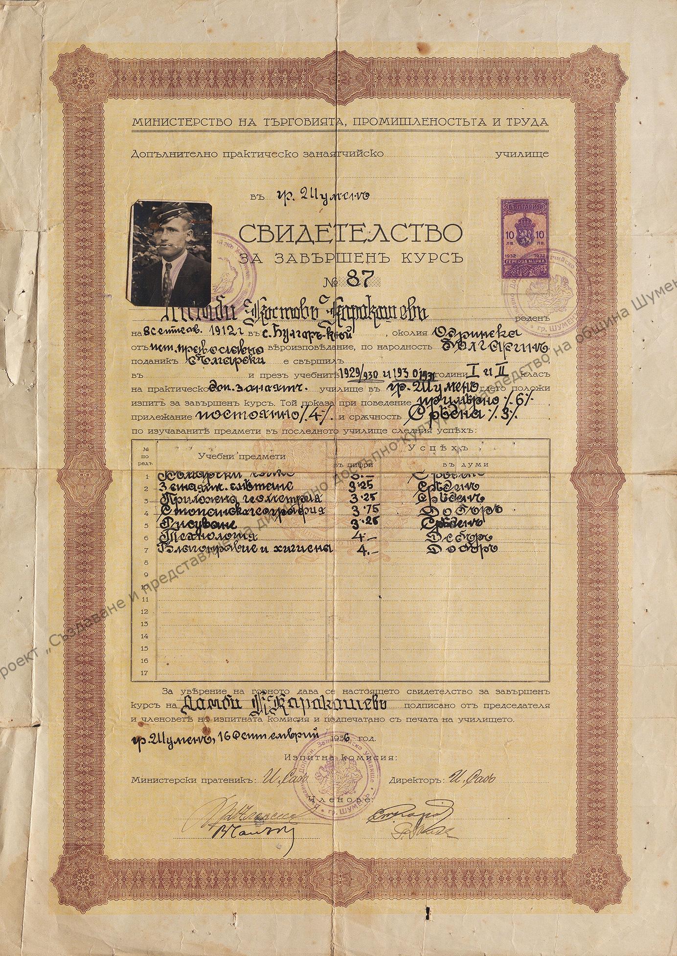 Issued to Lambi Kostov Karakashev for completing course by Auxiliary Practical Crafts School in Shumen, 1936