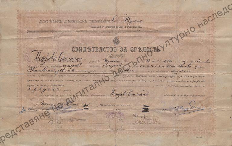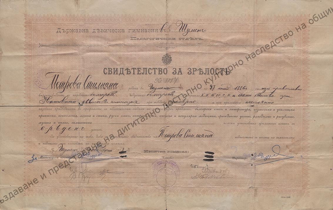 Matriculation certificate of Stiliyana Petrova Tsaneva – teacher from Shumen, who graduated from the Nancho Girls’ High School in 1908