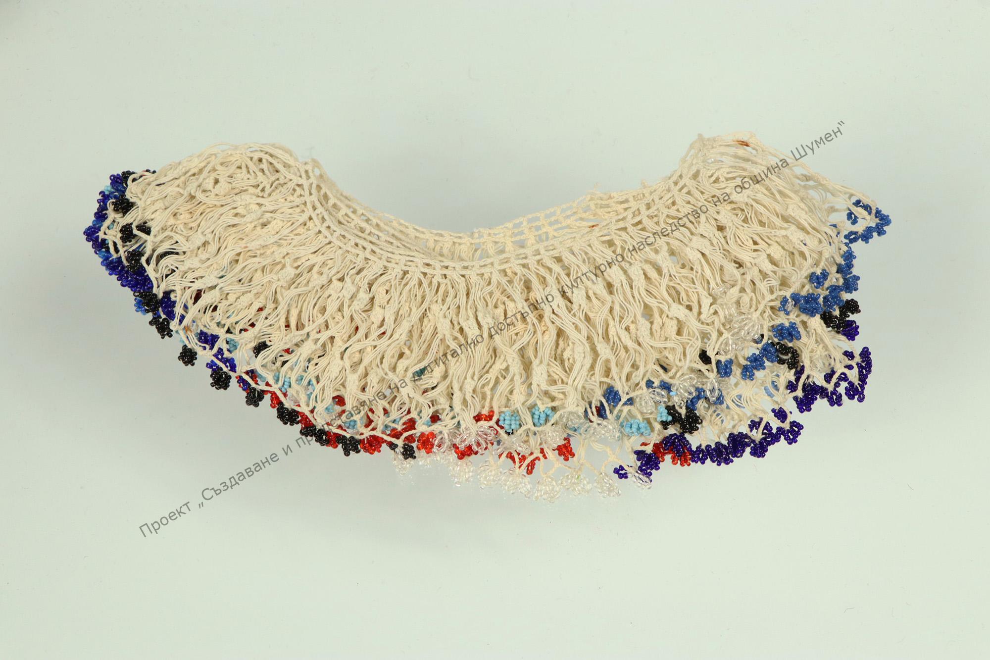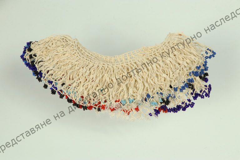 Coloured beads attached to white cotton thread woven lace. Placed on the brim of man’s kerchief, worn around the neck as accessory