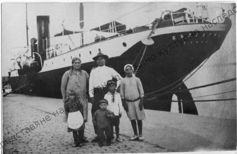 Дена и Стоян от с. Овчарово с децата във Варна на пристанището. Зад тях е корабът „България“, 1933 г.