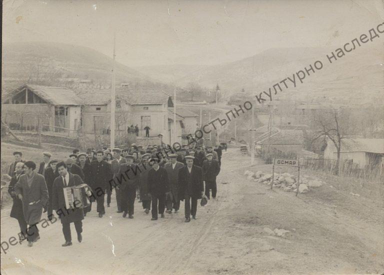 Мъже от с. Осмар на път към местността „Кор-балар“, за да празнуват Трифон Зарезан, 14. II. 1966 г.