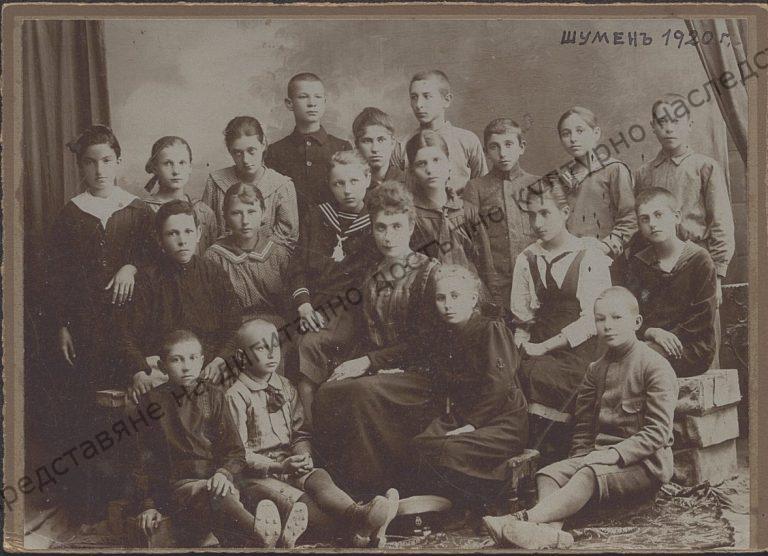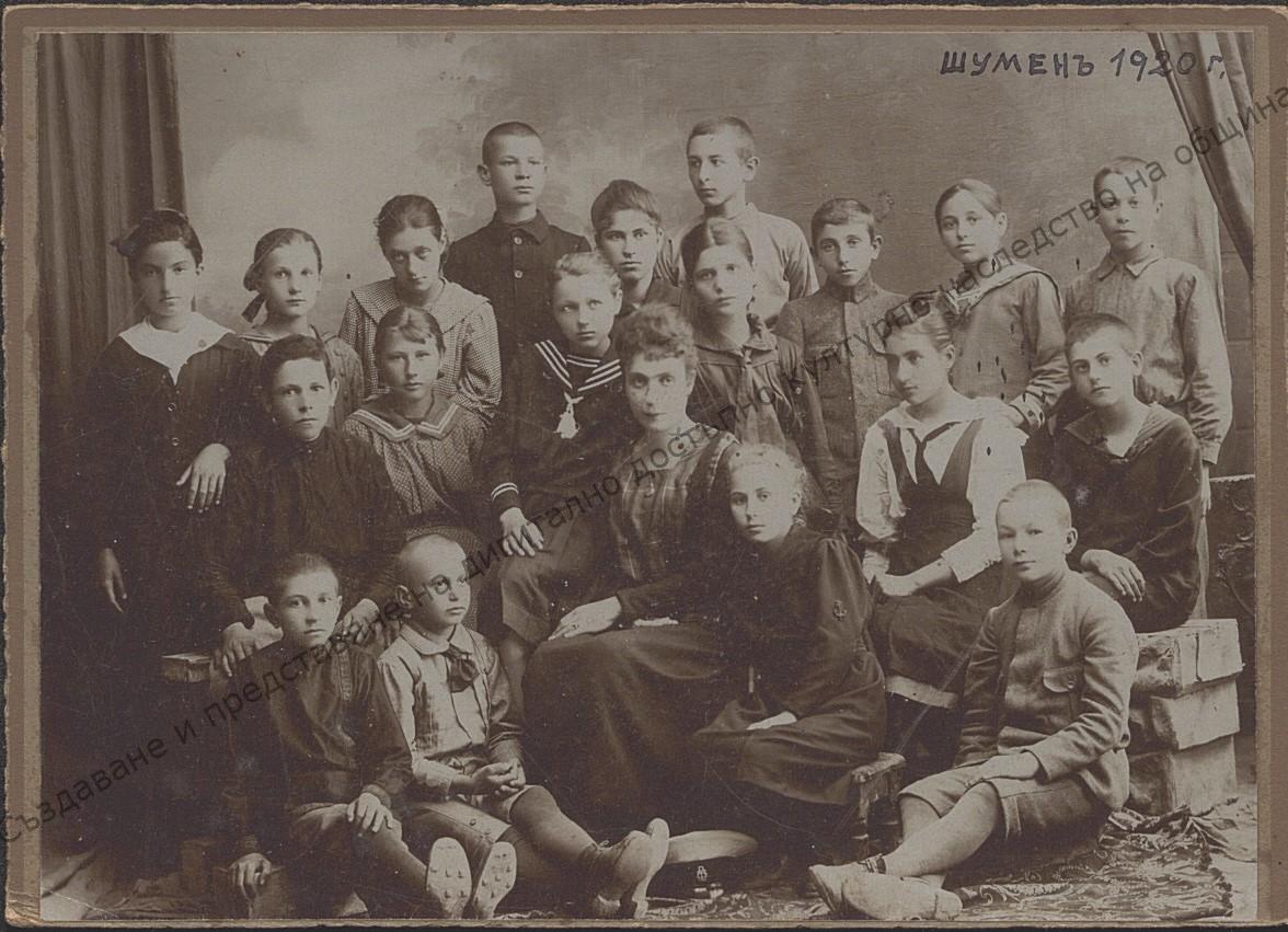 II прогимназиален клас с учителка Гинка Кандиларова, 1920 г., Шумен. Стара техника