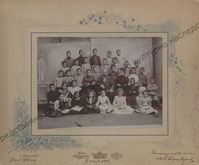 Ученици от IV отделение с учителя Куюмджиев през юни 1901 г. Изработена от фото на Братя Маркарян