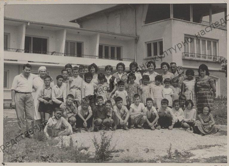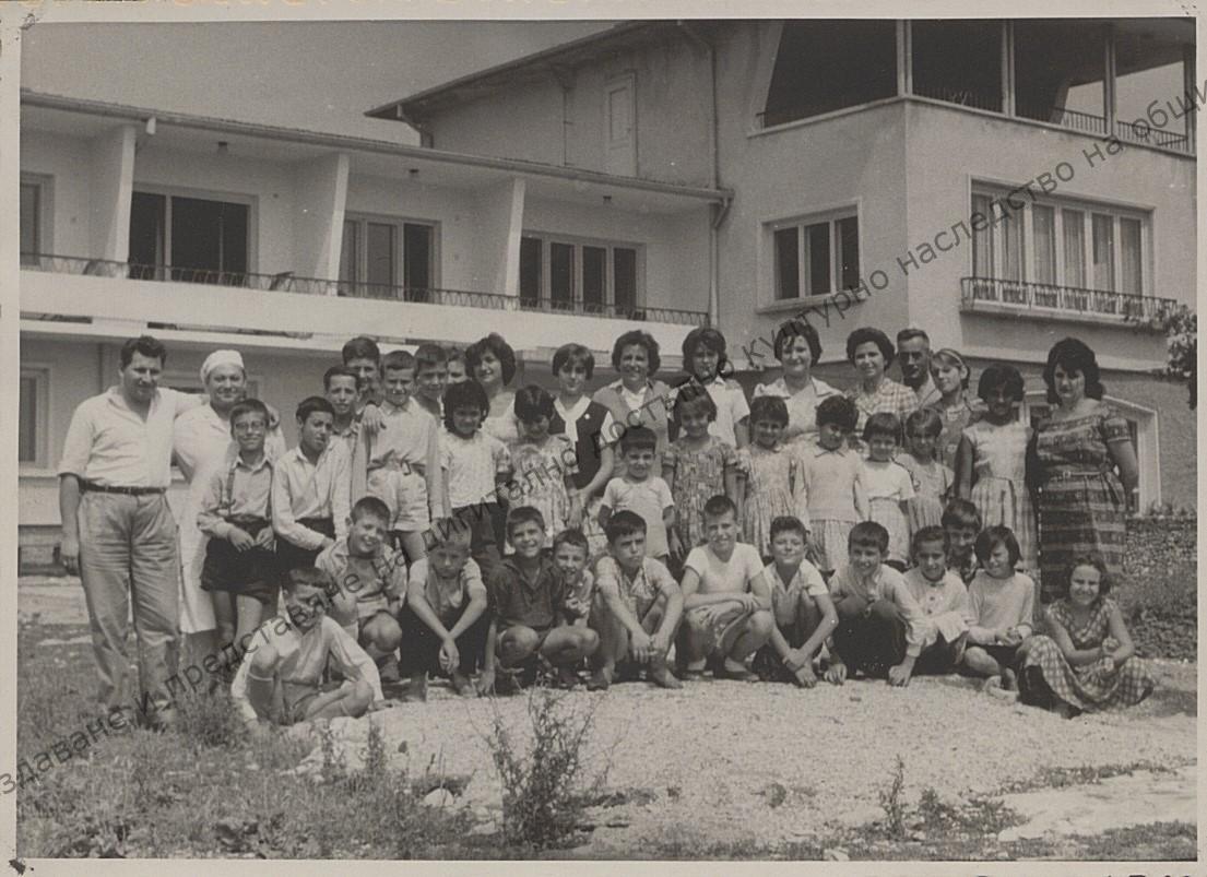Tobacco workers with their children in front of the recreation centre of the Tobacco Factory, 1963