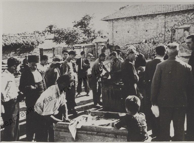Labour and culture brigade in the village of D-r Stamboliyski. Workers from the town helping villagers, 1945