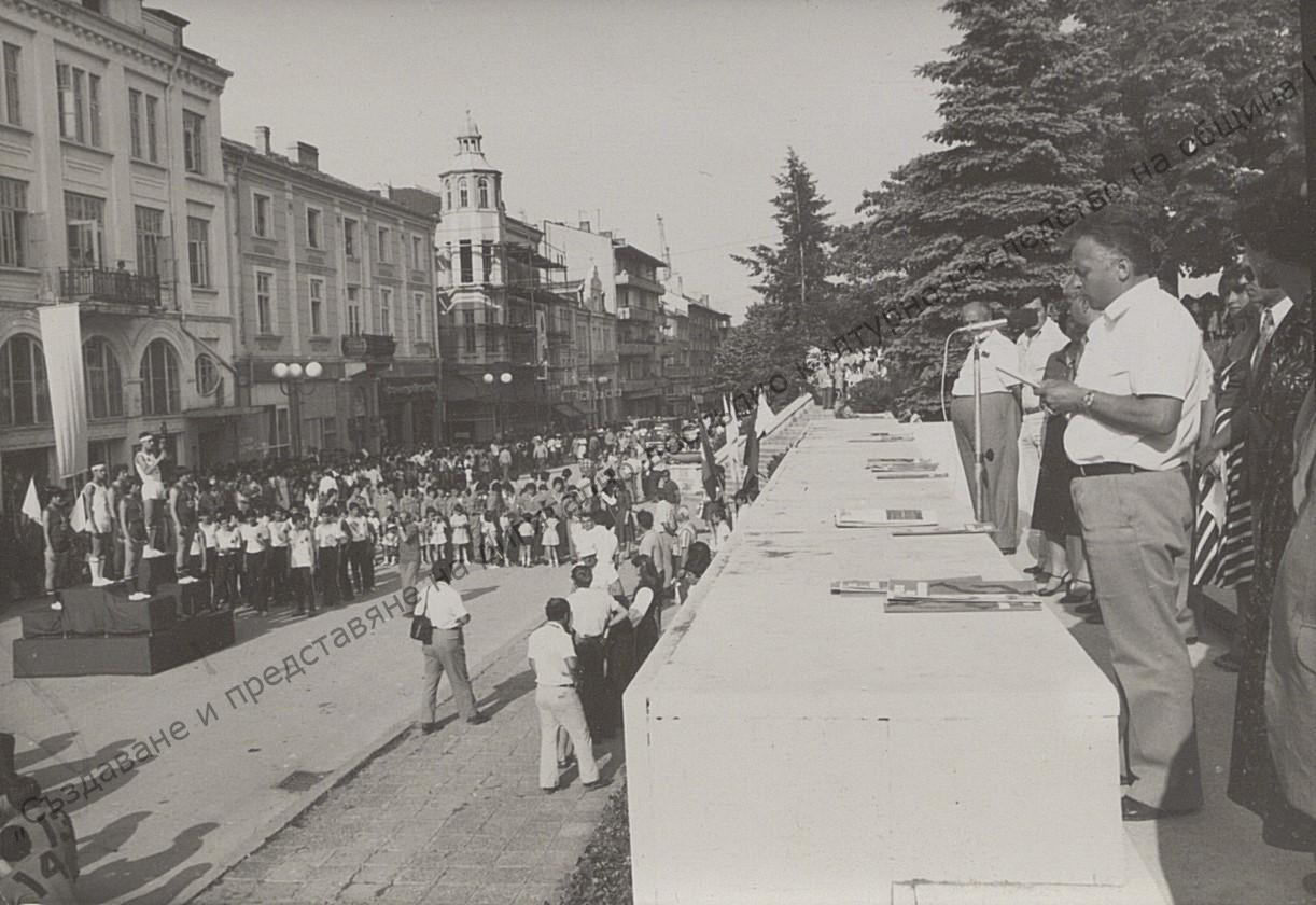 Solemn welcoming of the Olympic flame for the Moscow Olympic Games, Shumen, July 1980. Yovko Gospodinov – Chairman of the Executive Committee of the District People’s Council reads a greeting