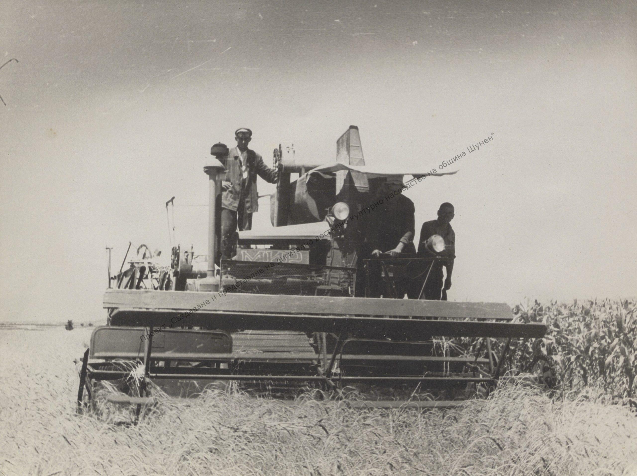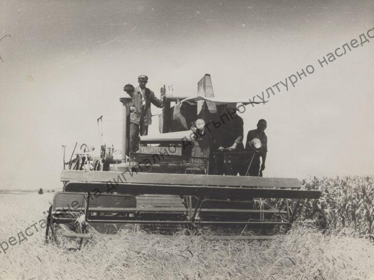 The first self-propelled combine harvester in the cooperative farm in the village of Drumevo, 1955/56