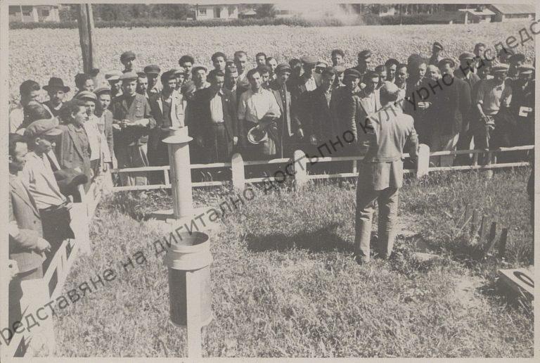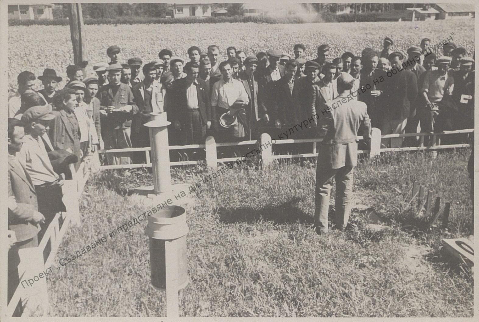 Hristo Kanchev and other participants in the course for cooperative farm chairmen at exchange of experience in Sofia region, 1951