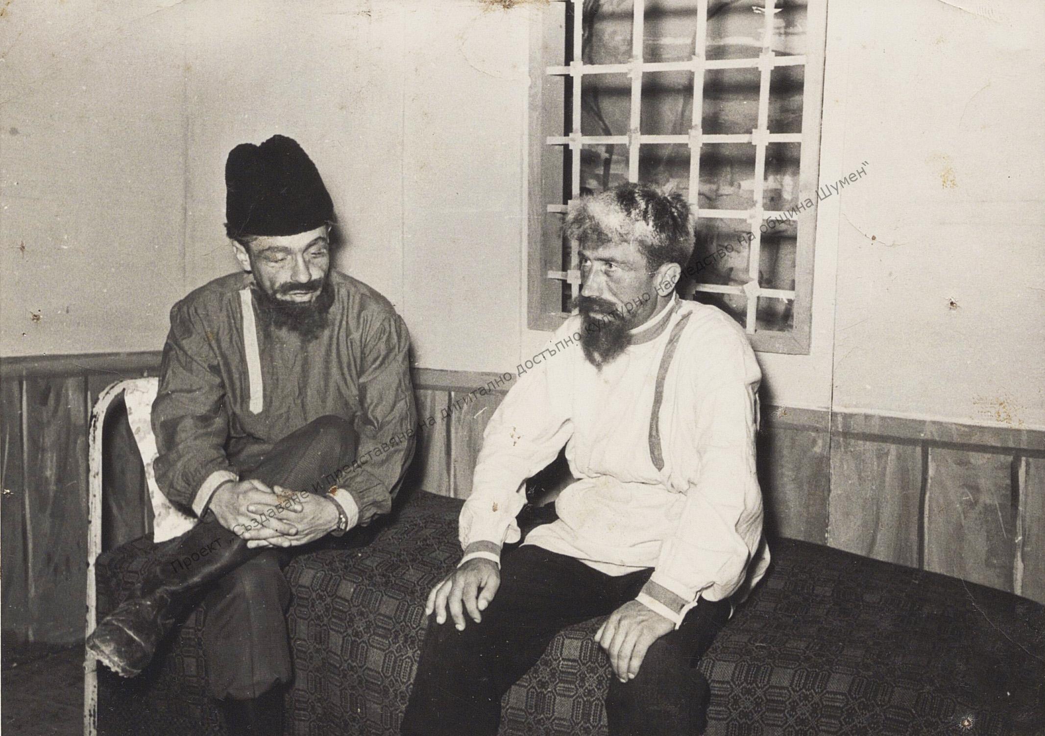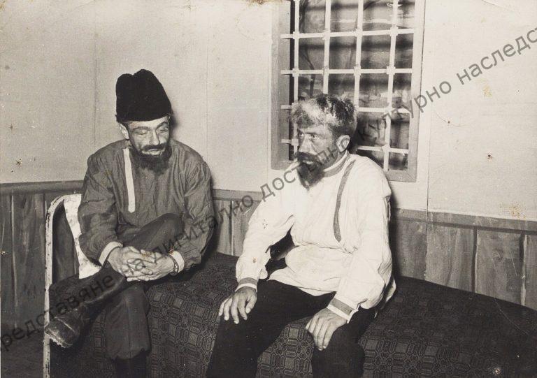 Varbi Yordanov Simeonov and Gospodin Dimitrov Georgiev in the “Naymichka” play, the village of Ivanovo, amateur performance group, 1972