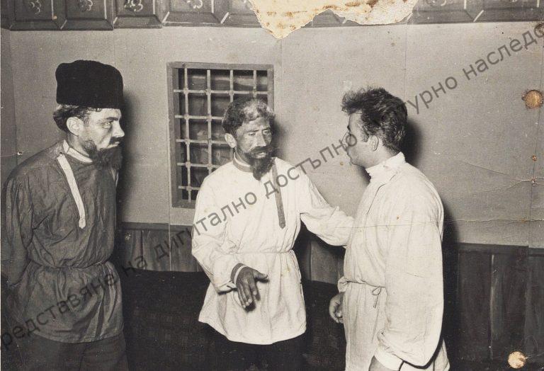 Varbi Yordanov Simeonov, Gospodin Dimitrov Georgiev and Zhivko Sotirov Georgiev in the “Naymichka” play, the village of Ivanovo, amateur performance group, 1972
