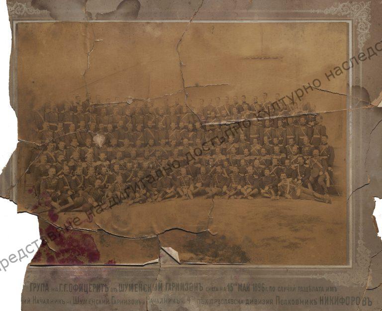 Group of officers from Shumen Garrison photographed on the 15th of May 1896 on the occasion of their parting with the head of the Shumen Garrison and head of the 4th Preslav Infantry Division – Colonel Nikiforov