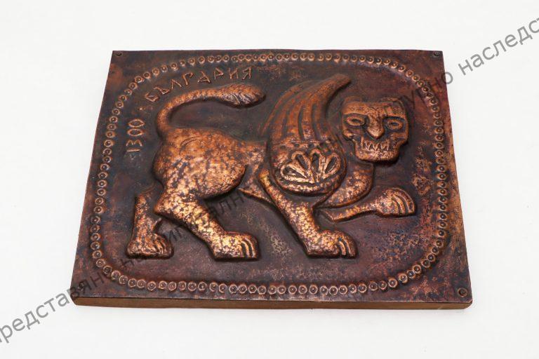От медна ламарина, дървена подложка. Изобразява Старозагорския лъв и надпис. Изработен от Васил Антонов Атанасов, Шумен