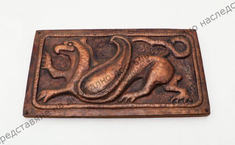Металопластика – мед. Дървена подложка. Изобразен е грифон. Автор Васил Антонов