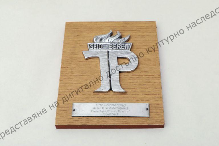 Върху дървена основа са закрепени метални букви и плочка с надпис на немски език