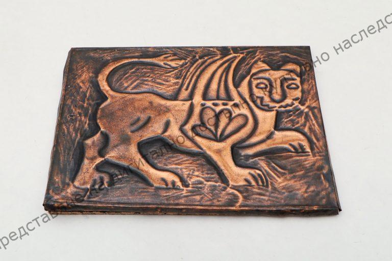 От медно фолио, дървена подложка. Изобразява Старозагорския лъв
