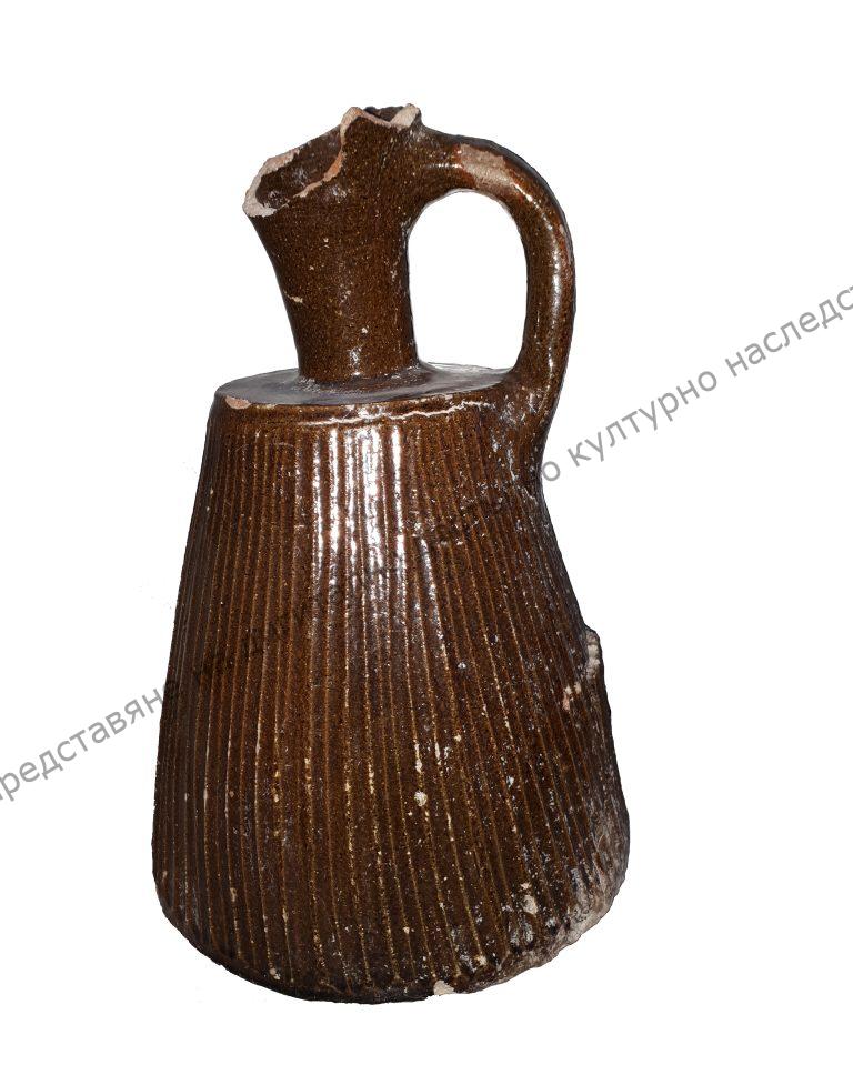 От добре изпечена глина, с форма на пресечен конус. Украсен с отвесни бразди