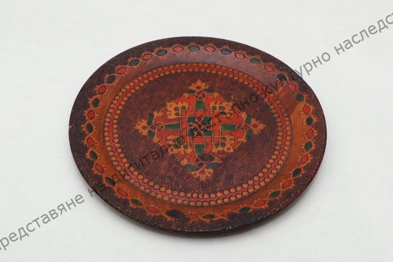 Wooden. Pyrographed and colour decorated, geometric figure at the centre
