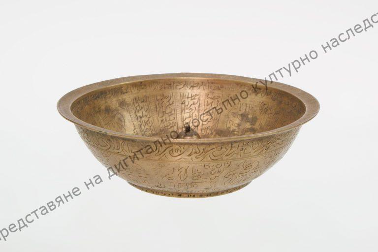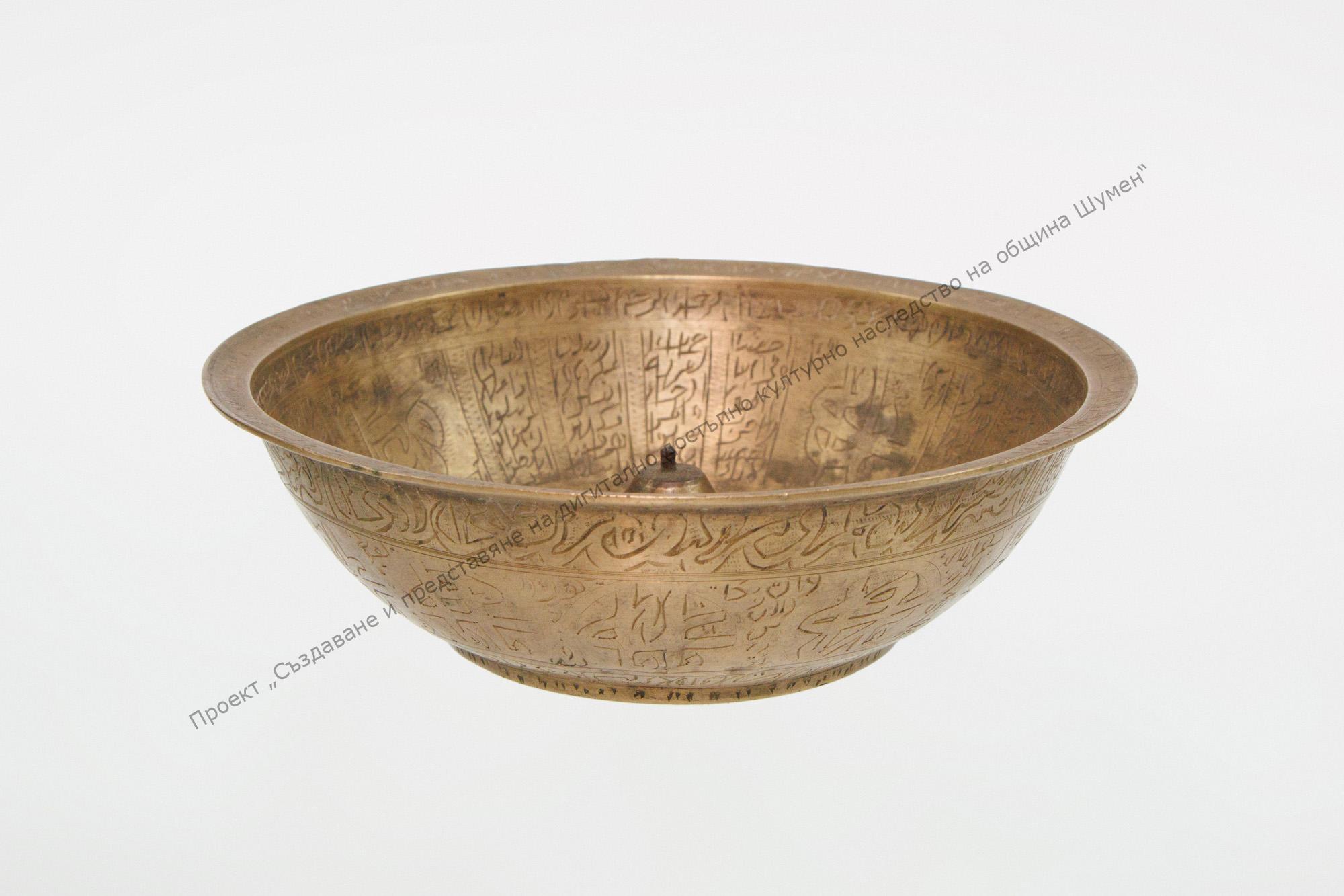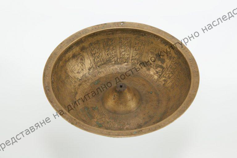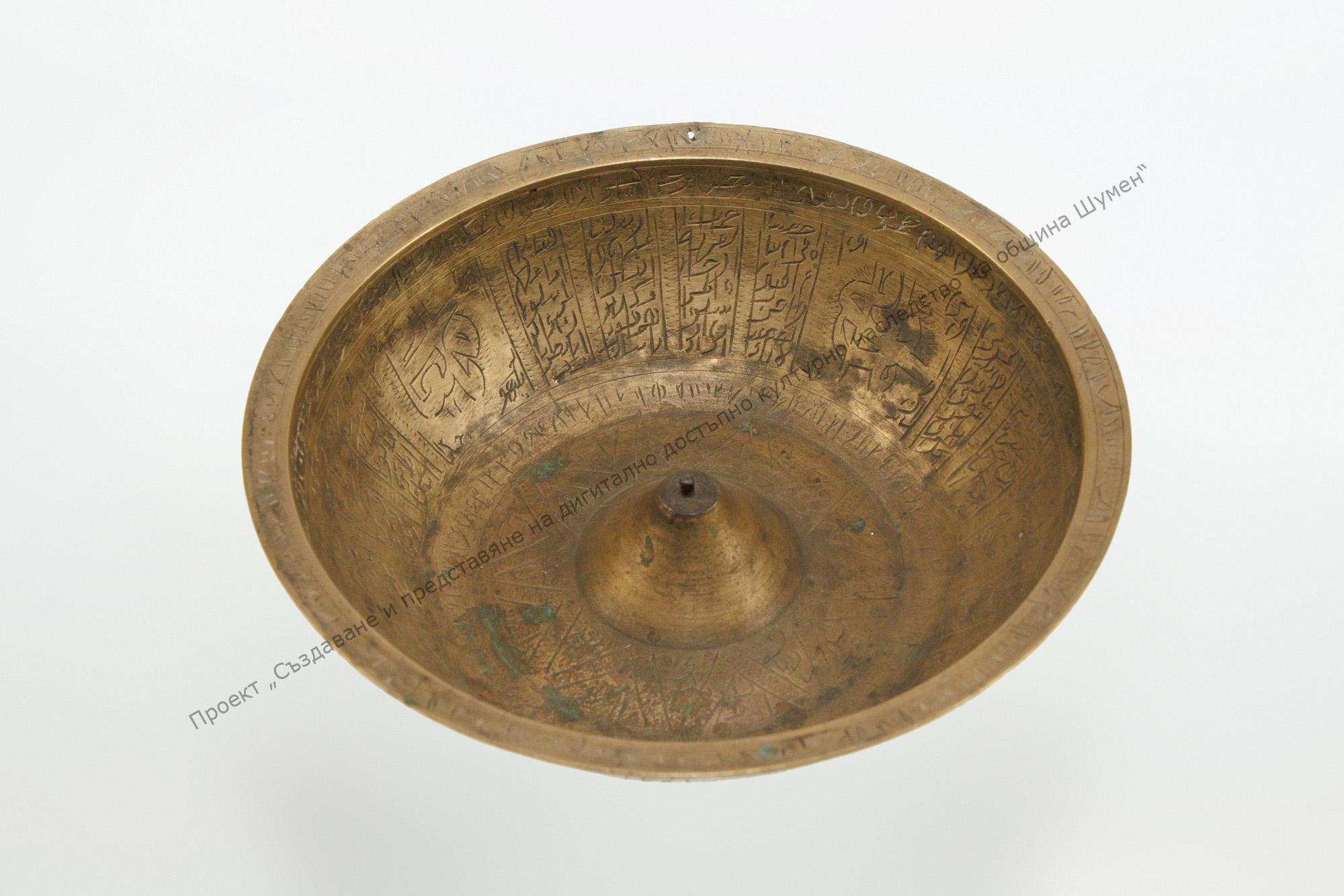 From candlestick, made of brass. Inside and outside decorated with Arabic calligraphic ornaments