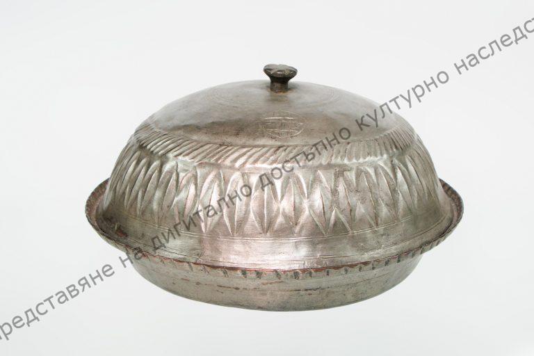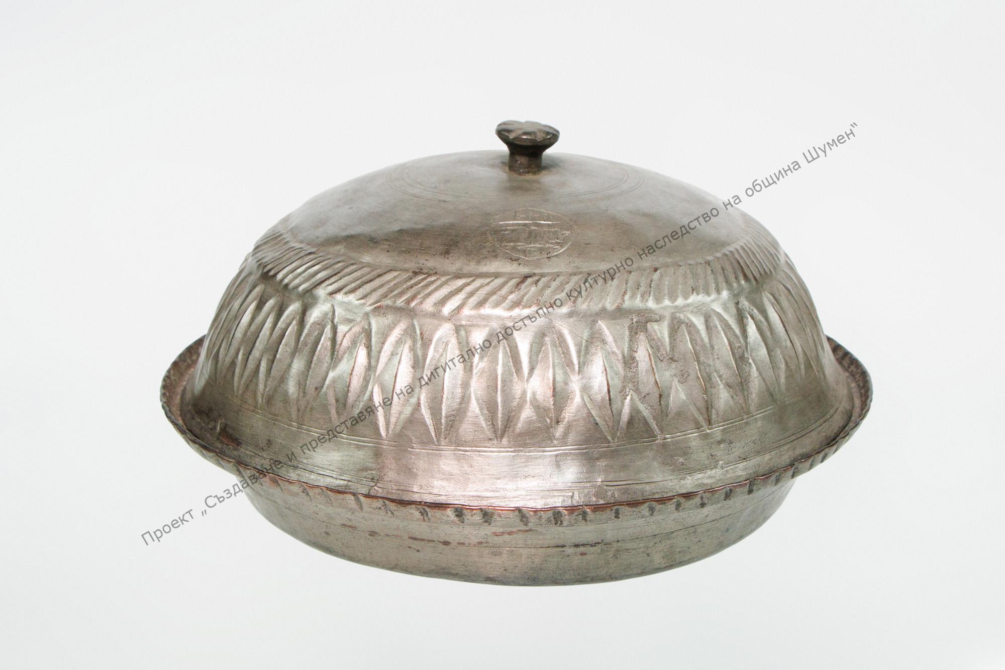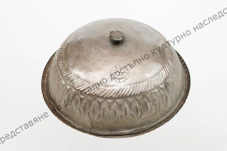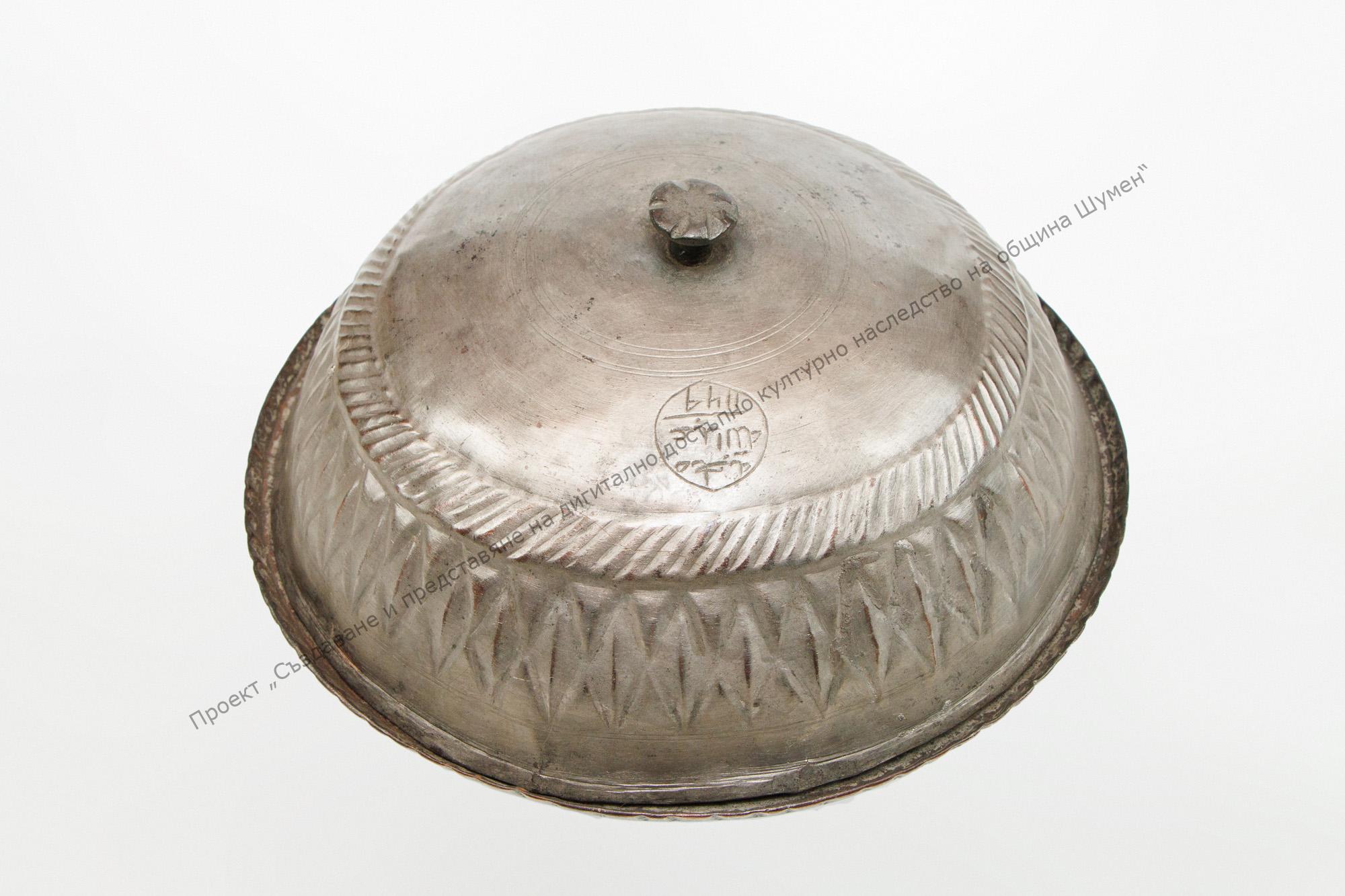 Copper, tinned, with lid. Decorated with geometric ornaments and Arabic letters