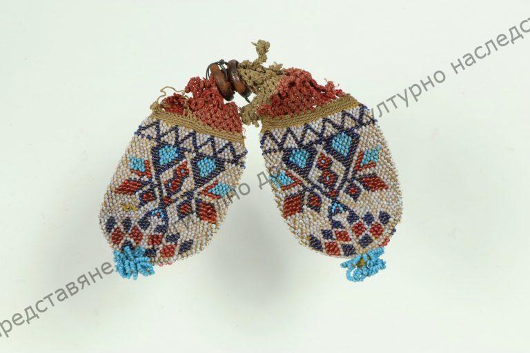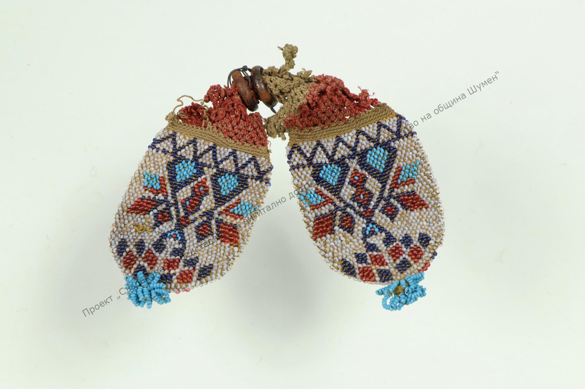 For coins. Of woven cotton threads, multicoloured beads inserted for decoration, forming geometric and floral ornaments